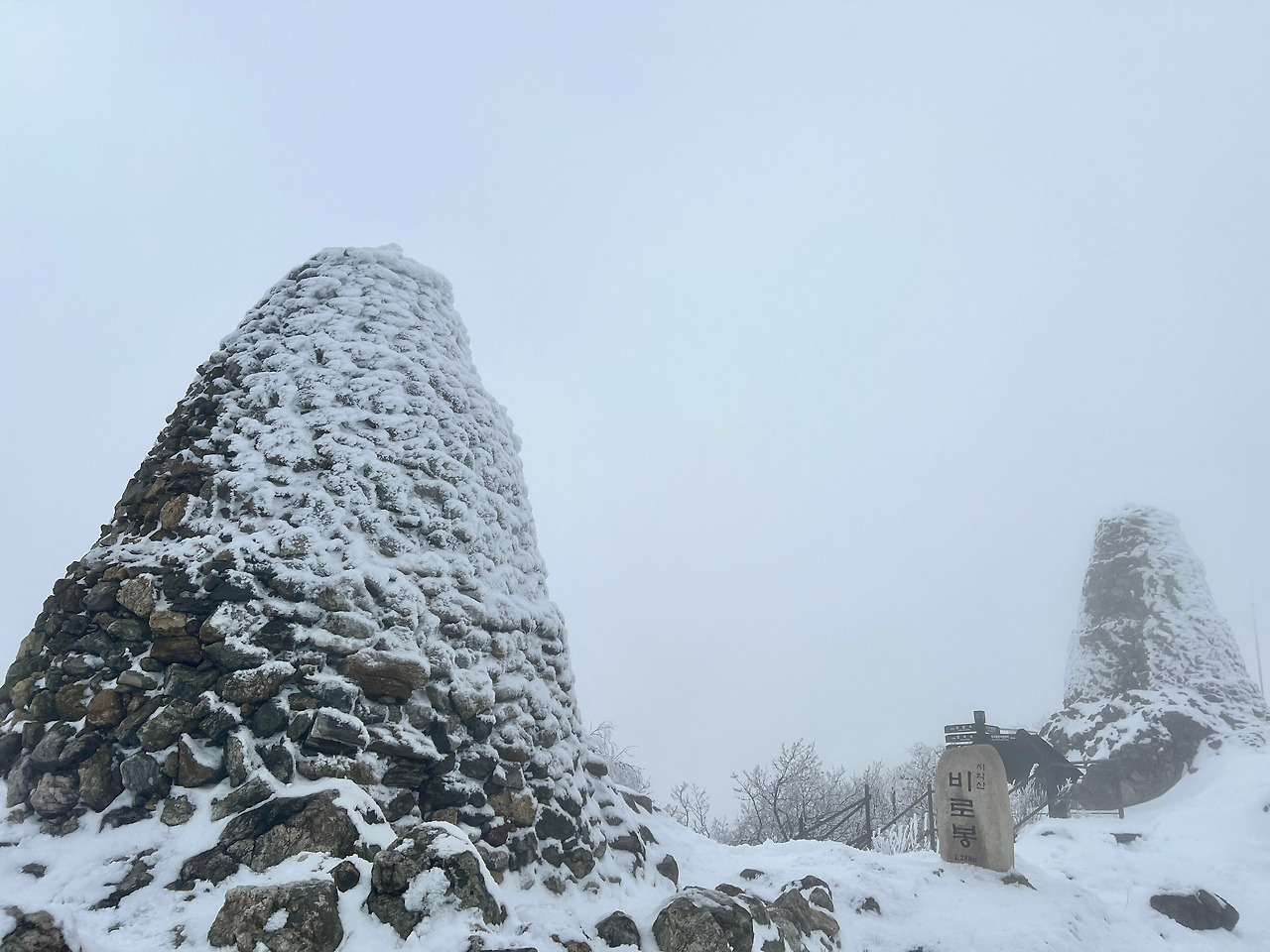 비로봉에 마침내 도착했을 때, 우리는 안도했고 감격했다. 셋이 손을 잡고 덩실덩실 춤을 추고 싶은 심정이었다. 눈은 그쳤으나 안개는 가득했다. 한 사람이 2년 동안 쌓았다는 전설 같은 미륵 불탑 3개가 눈에 덮인 채 고고히 서 있었다. 몇 안 되는 등산객들은 식사를 마치고 각자의 길로 내려가고 우리만 남았다. 하얀 안개 속에서 눈꽃 가득한 나무들에 둘러싸여 다시 우리 셋 뿐이었다.