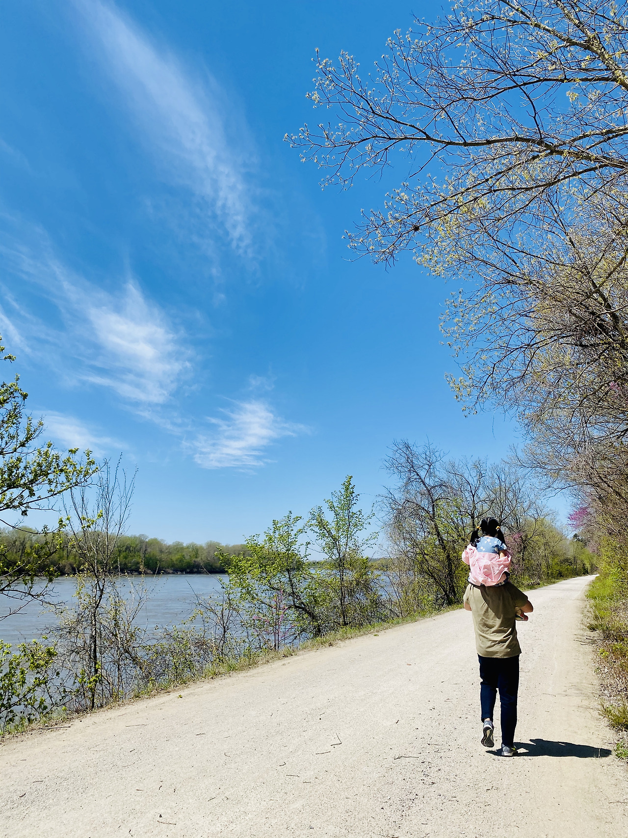 케이티 트레일은 미주리 강을 따라 나무젓가락 같이 쭉 곧은 직선으로 펼쳐져 있었다. 단단하고 평평한 트레일 표면은 은은한 회색의 자잘한 돌들이 깔려있어서 발 밑에서 까끌거렸다. 무리 지어서 혹은 혼자서 자전거를 타는 사람들이 보였고, 우리처럼 가족 단위로 산책 온 사람들도 있었다.