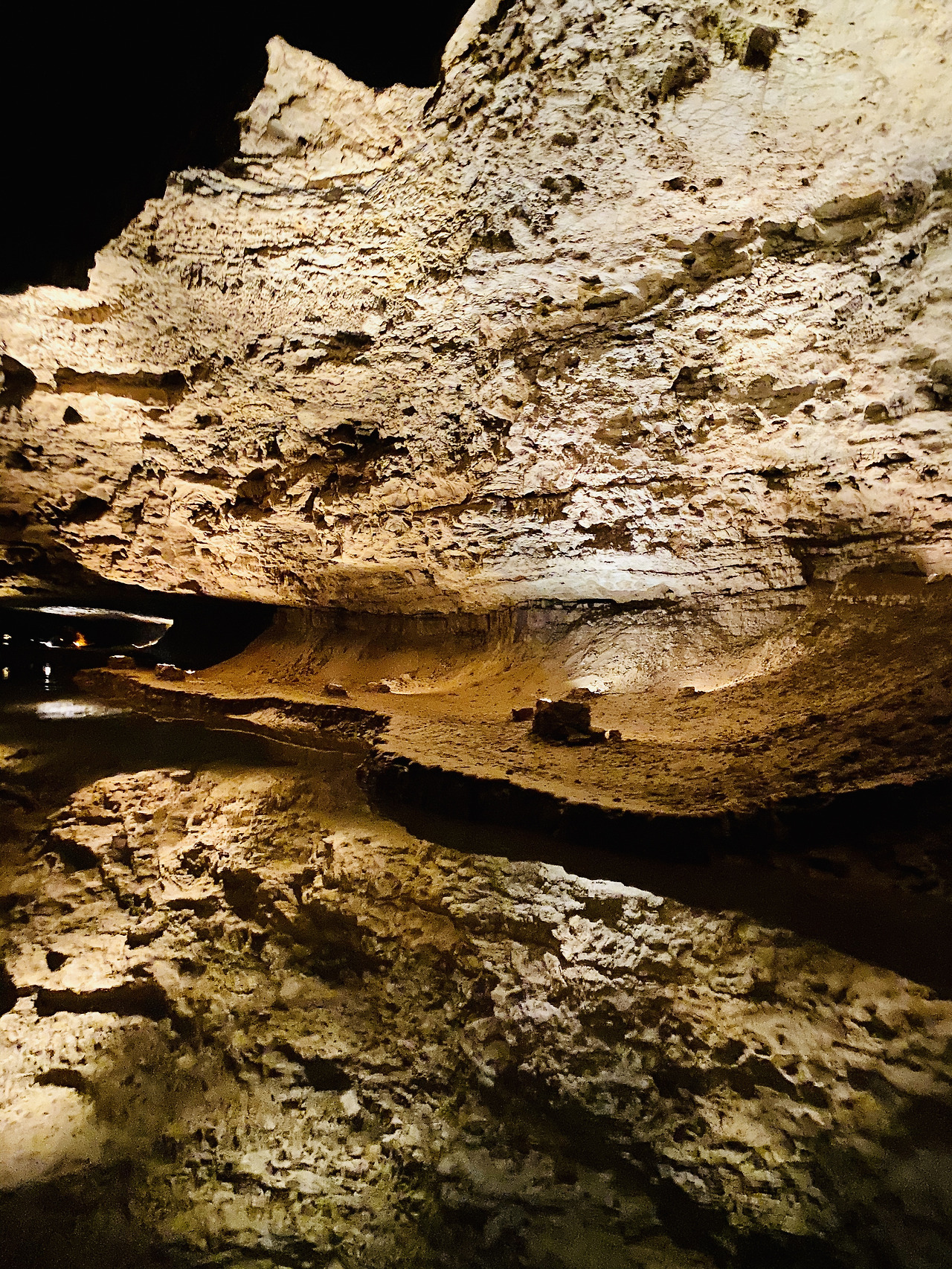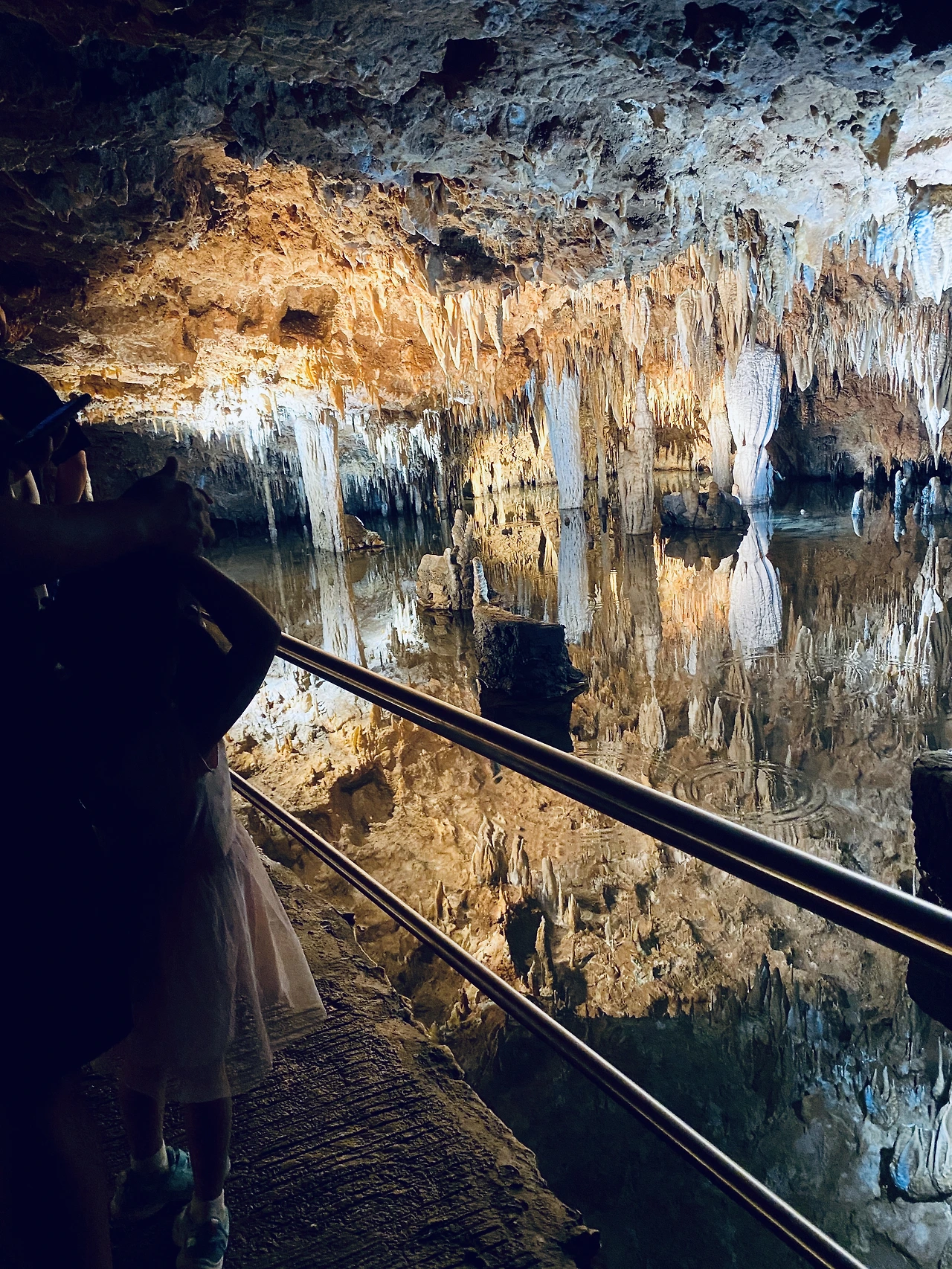 연중 15도를 유지하는 동굴 안에서 다시금 소름이 돋았다. 낮은 천장에 고드름 같은 종유석이 촘촘히 박혀있고 조명을 받아 황금빛이 났다. 석주로 보이는 굵고 기다란 기둥들은 물속에 잠겨있는 것인지 물 위에서 비친 것인지 헷갈렸다. 수면 위로 그려지는 물동그라미는 유유히 춤을 추고 있었다.