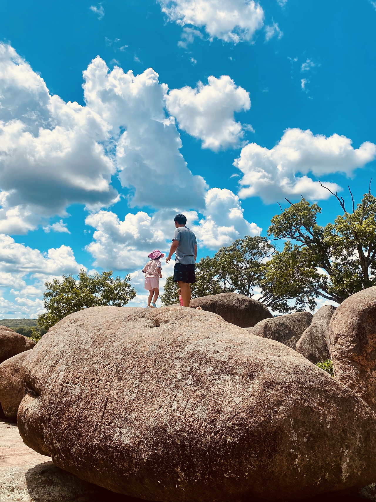 통통한 감자처럼 뭉텅하게 생긴 큰 바위들이 마치 이곳이 그들의 마을인 듯 바위산 위에 모여 있었다. 우리보다 먼저 온 몇몇의 아이들이 보였다. 바위 위를 오르고 있거나 이미 올라갔거나 아님 오를 예정이거나. 어릴 적 학교 놀이터에 있던 알록달록 정글짐이 생각났다. 매 움직임마다 끊임없는 선택으로 길을 만들어 올라가는 짜릿함이 아이들에게서 느껴졌다. 꽤 높은 바위에 올라가 있는 어떤 아이는 매의 눈빛으로 다음 탐험 장소를 물색하는 듯했다. 허리춤에 두 팔을 올린 채 사뭇 진지하게.