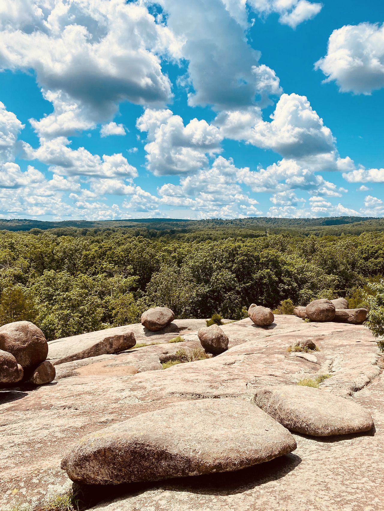 어느 정도 올라갔을까. 7월의 햇살이 만든 땀을 닦아내며 주변을 돌아보았다. 무엇하나 걸릴 것 없이 탁 트인 하늘과 빽빽한 초록 숲이 어우러진 이곳에서, 붉은빛(또는 핑크빛) 바위들이 나는 진작에 맘에 들었다. 갈라진 틈 사이를 비집고 자리 잡은 크고 작은 나무들이 무성하고, 키 낮은 연둣빛 풀들은 잔디처럼 보송했다. 바위들은 경기장의 야구 선수들같이 각자 정해진 위치가 있는 듯 자연스러웠다. 오늘따라 하늘을 가득 채운 뭉게구름은 선수들을 응원하는 관중처럼 마냥 해맑았다.