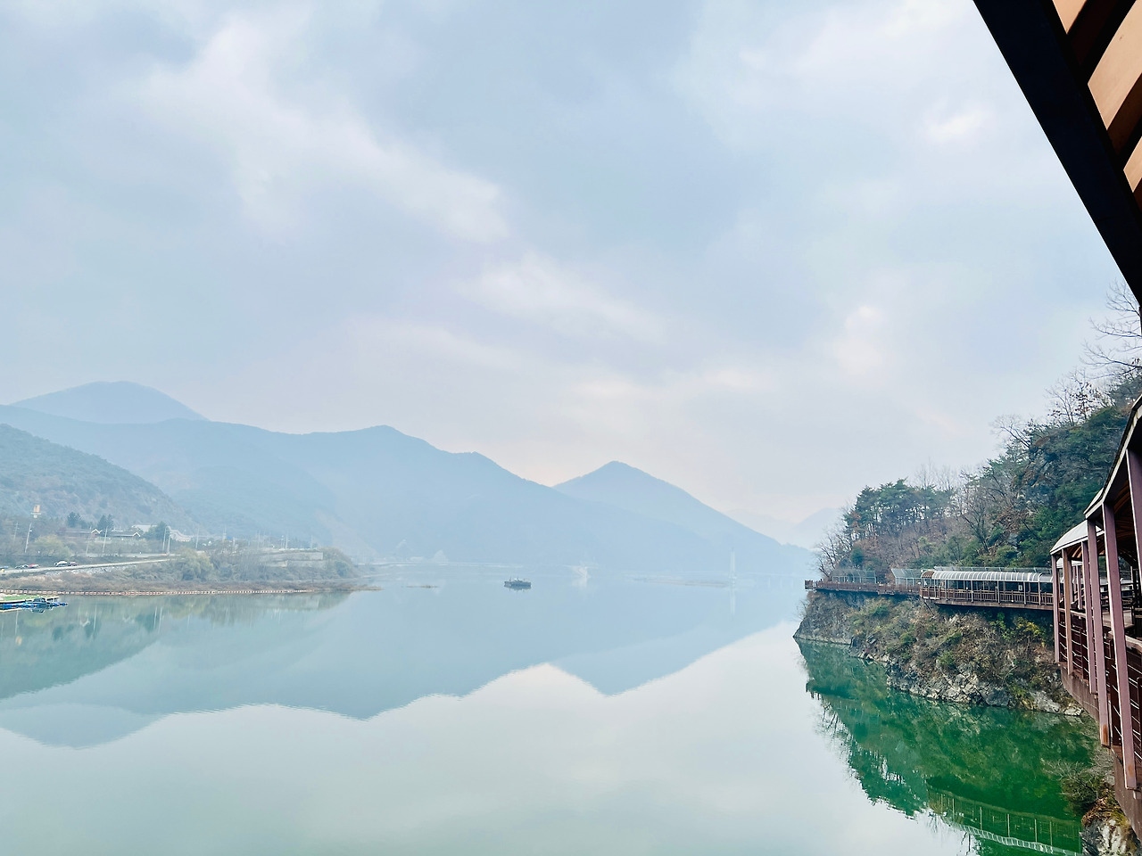딸아이가 학교 간 사이 남편과 둘이 온 길이었다. 돌아갈 시간이 빠듯했으나, 강물은 빨려드는 갯벌처럼 나의 발목을 붙잡고 놓지 않았다. 한 무리의 원앙이 푸드덕 날아와서 차분한 물그림자를 깨트렸다. 물 위에 그려진 동그란 파장이 사라지고 다시 고요의 거울이 될 때까지, 우리는 잔도 끝에 서 있었다.