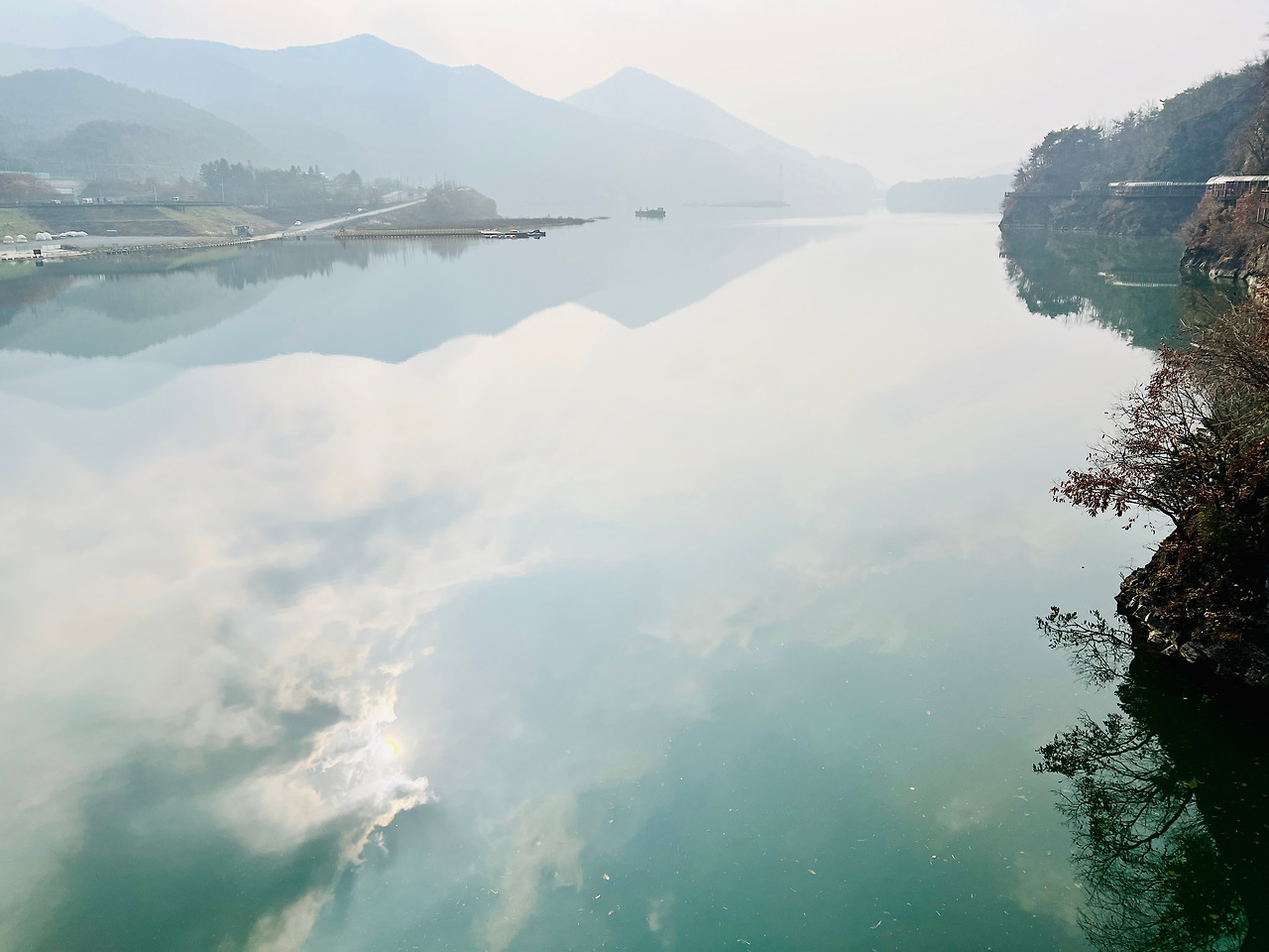 멀리 보이는 소백산줄기는 높다고 자만하지 않고 하늘 아래 겸손했다. 우아하고 기품 있는 자태가 꼭 이곳이어야 했다. 강물에 비친 겹겹의 산등선은, 어릴 적 미술시간 물감을 짜 넣은 색종이를 접었다 펼치면 나타났던 데칼코마니였다.