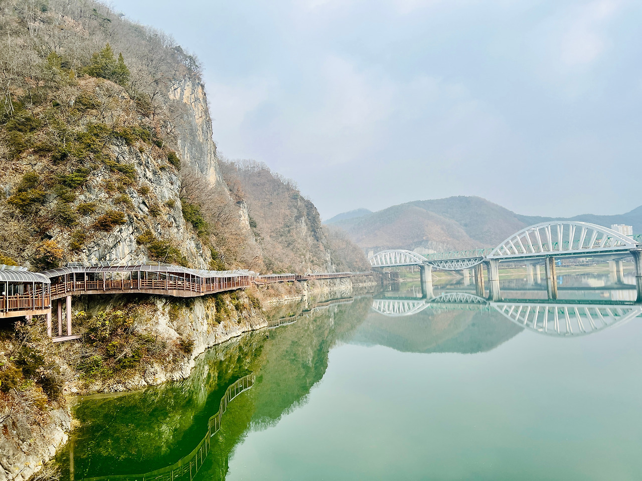 고소공포가 있는 나로서는 데크길이 얼마나 높은 곳에 달려 있는지, 구멍 뚫린 철망 바닥이 얼마나 자주 나타나는지 신경 쓰일 법도 했지만, 그럴 겨를이 없었다. 억겁의 시간을 간직한 기암절벽을 마주 보는 남한강의 잔잔함에, 세상 모든 소음을 집어삼킨 듯한 고요함에, 내 시선은 오로지 푸른 강을 향해 있었다.