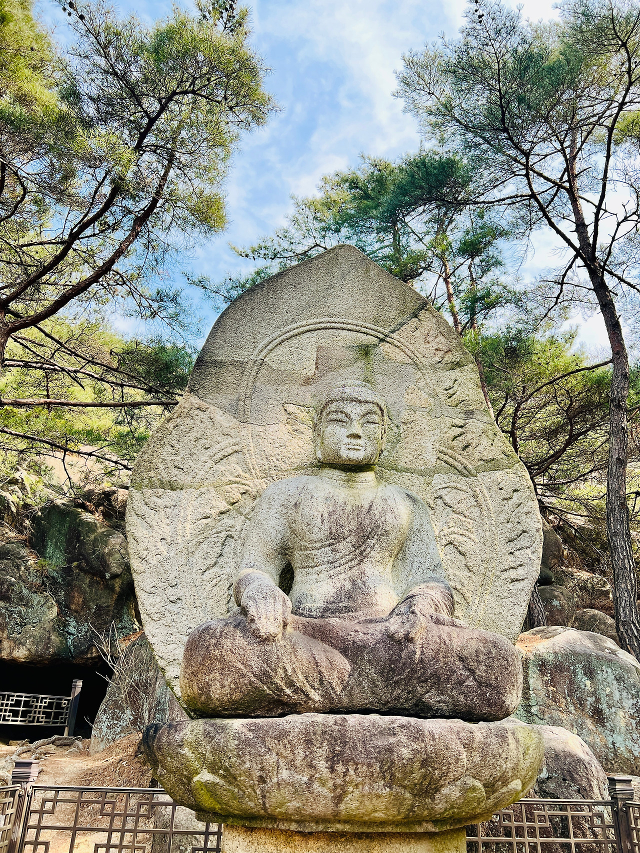 보물로 지정된 불상을 마주한다. 아니, 우러러본다. 거대한 바위를 연이어 밟고 올라갔으나 그의 발 밑에서 더 오를 수 없다. 얼굴을 가로지르는 상처의 흉터 같은 보수 흔적이 보인다. 이어 붙인 광배는 무늬가 없다. 이미 화강암 본연의 순수한 색을 잃어가고 있다. 그럼에도 불상의 앉은 자태와 표정에서 이 모든 불안 요소들을 잠재우는 듯한 압도적인 위엄을 읽는다. 섬세한 옷주름이 천년의 바람에 하늘거린다.