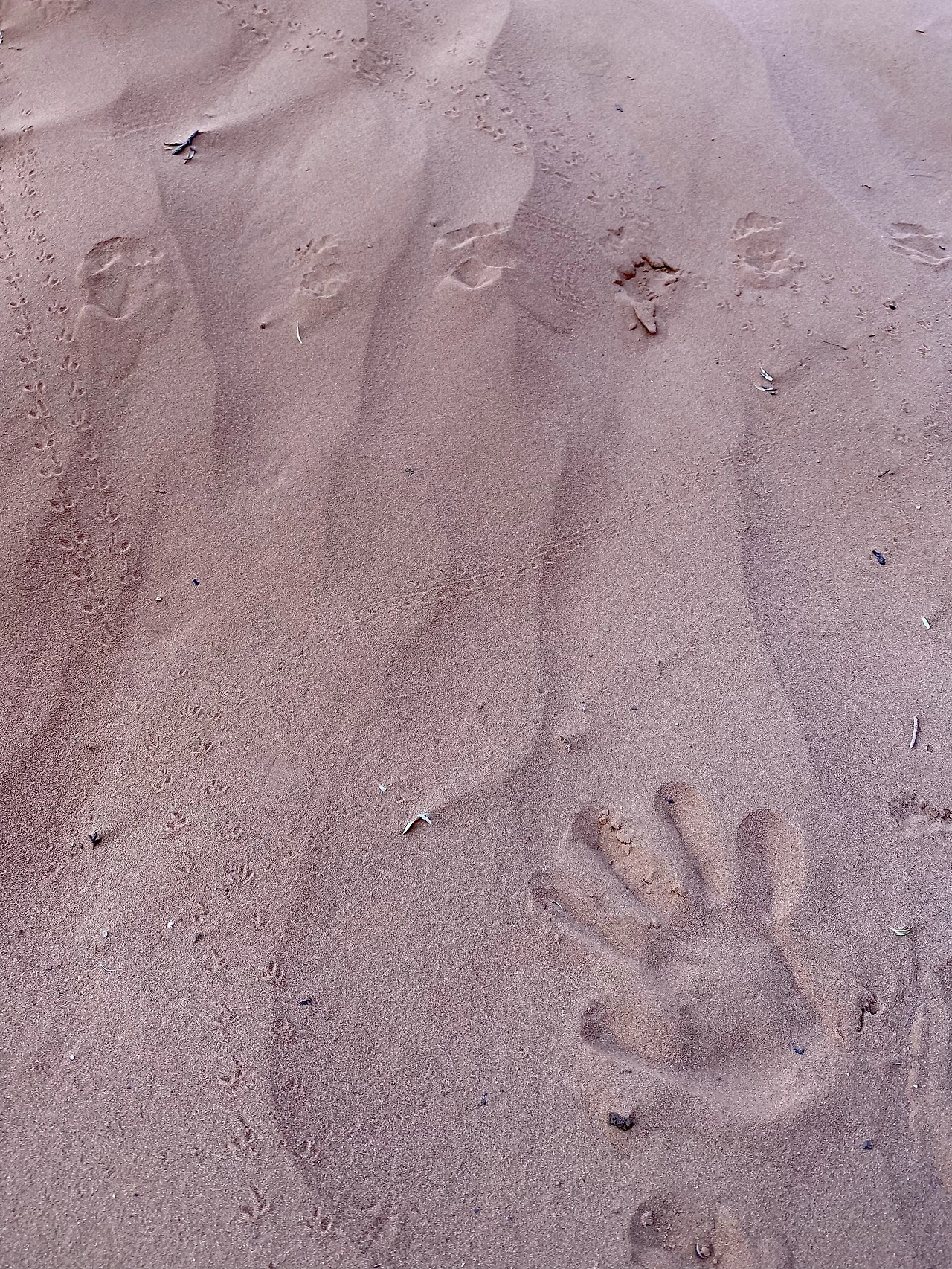 다음날 아침, 모래 위에 총총총 걸어간 누군가의 발자국에 웃음이 난다. 아이는 살며시 그 옆에 자신의 손바닥을 찍는다. 모래는 금세 바람에 날리고 사르르 흔적이 사라진다. 발자국을 남긴 동물들은 더 이상 이곳에 없고, 이 찰나도 순식간에 지나간다. 머릿속에는 많은 일들이 기억되고 삭제되는 것을 반복한다. 모래는 바위를 만들고 바위는 다시 모래가 된다. 빛으로 만들어진 무지개는 빛으로 사라진다.