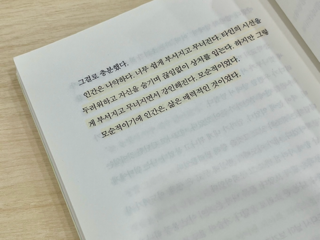 인간은 나약하다. 너무 쉽게 부서지고 무너진다. 타인의 시선을 두려워하고 자신을 숨기며 끊임없이 상처를 입는다. 하지만 그렇게 부서지고 무너지면서 강인해진다. 모순적이었다.