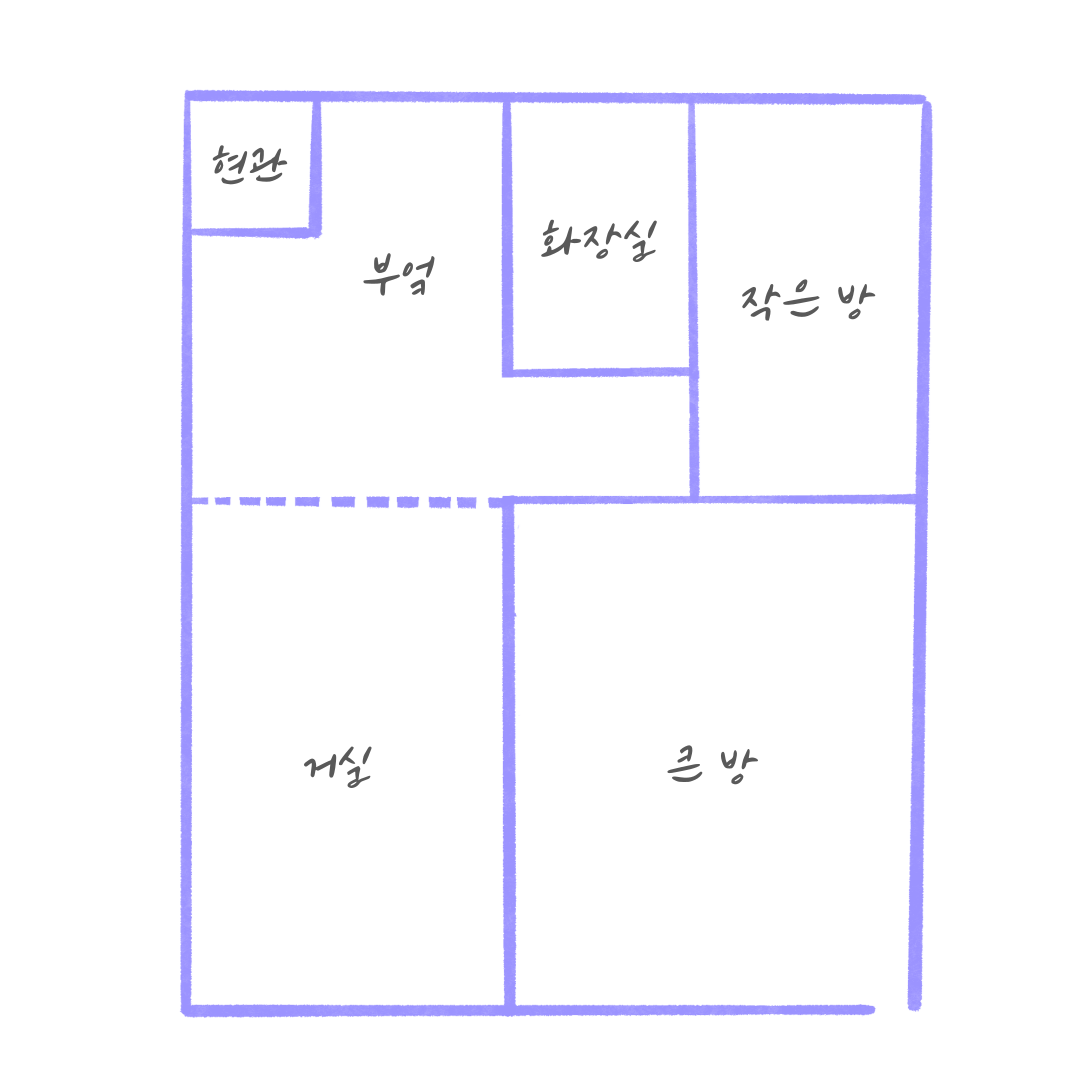 우리 집은 큰 방과 작은 방, 화장실 하나씩, 부엌은 거실과 이어지는 형태.