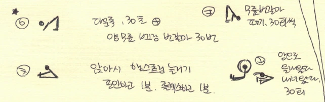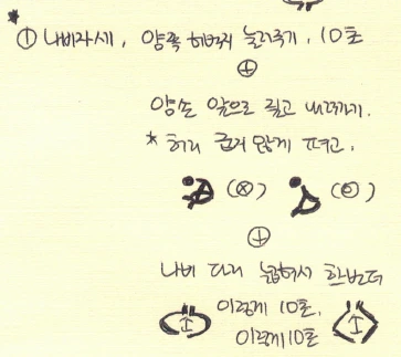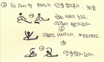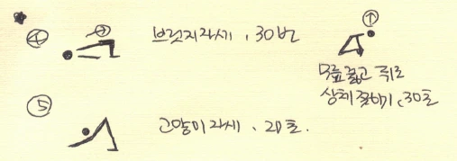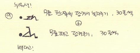 다 끝나면 양 팔 머리 위로 올린 상태로 아래로 내려갔다 올라갔다 반복 30회.