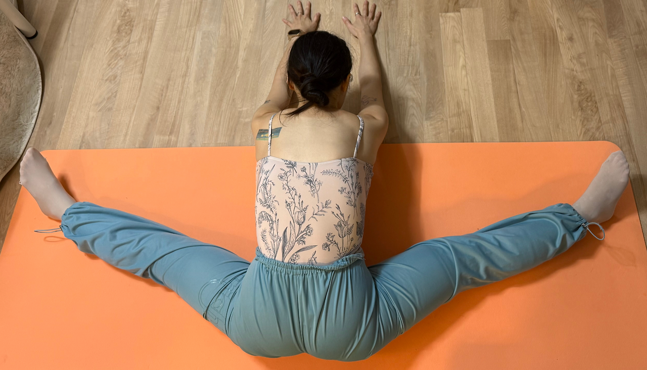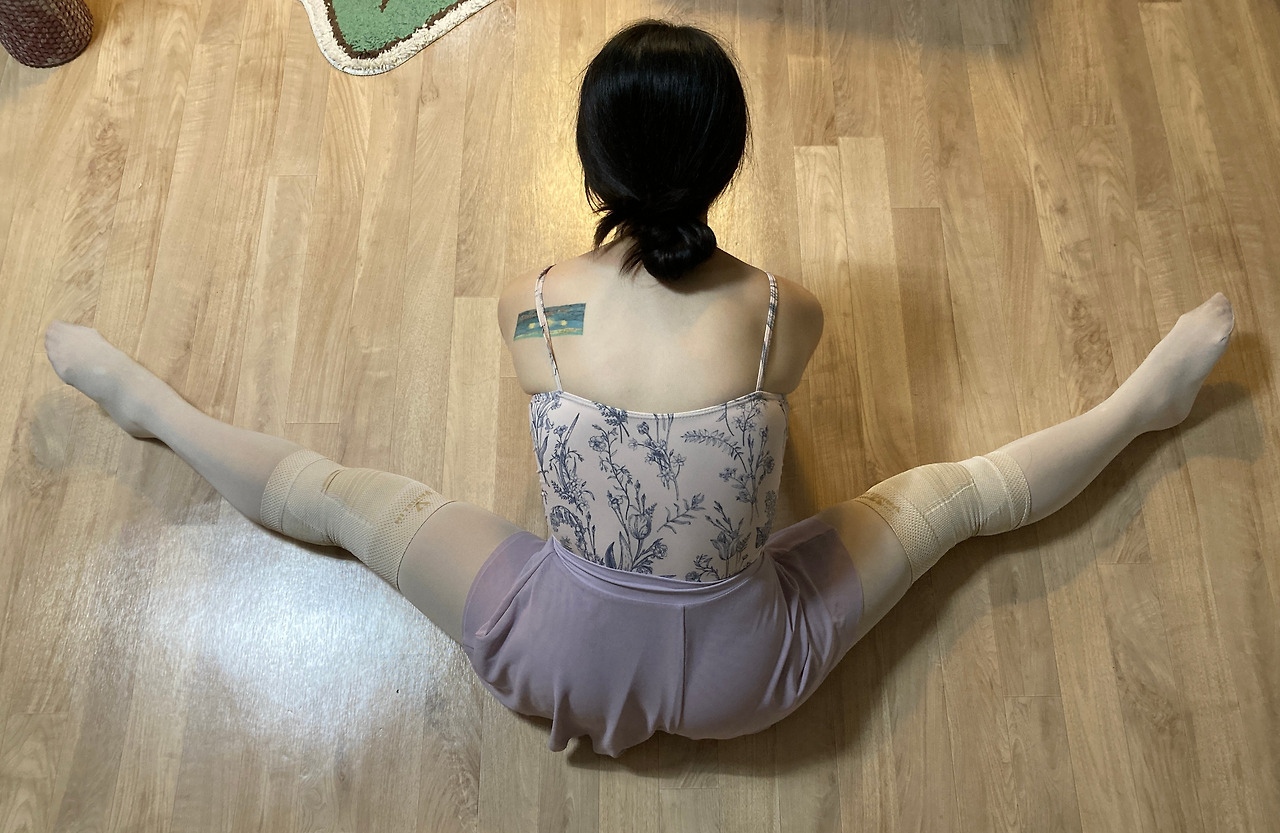 취미 발레 3년 차, 처음에는 다리를 70 도 이상으로 벌릴 수도 없었지만 이제는 어느새 일자 스트레칭이 가능하게 되었다.