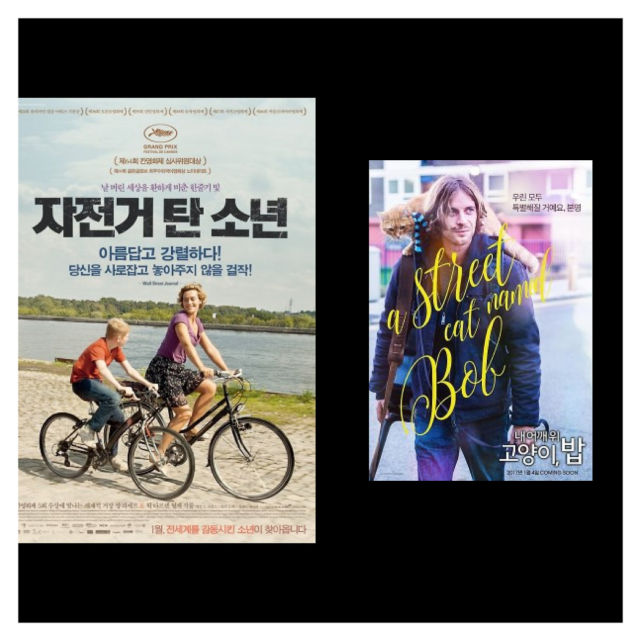 그리하여 우리에게 삶의 희망을 주는 영화들이 있죠. 그 중 두편, <자전거 탄 소년>과 <내 어깨 위의 고양이 밥> 입니다.