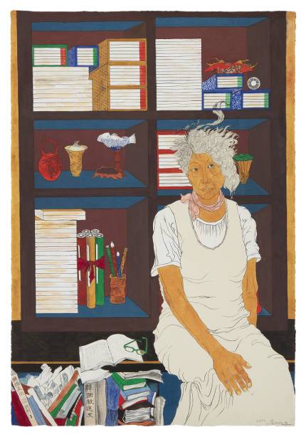 책거리와 같은 이미지를 배경으로 약간 치우치게 본인의 모습을 그려넣음으로써 여성들이 접하기 힘들었던 책과 지식의 세계를 나타내는 듯합니다.