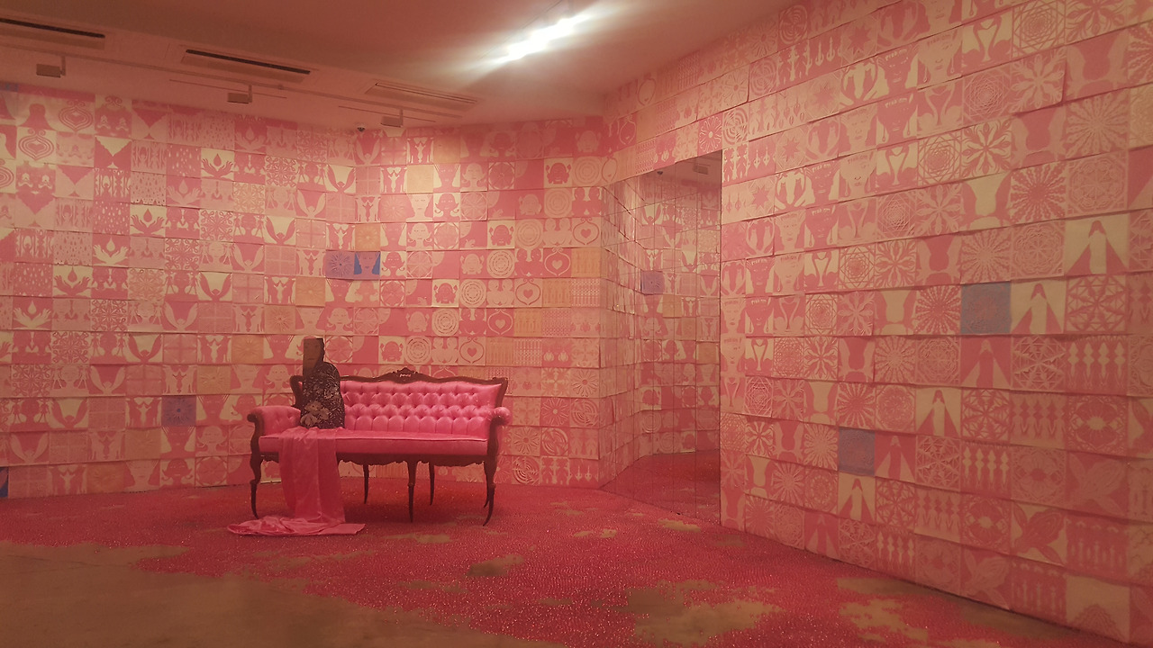"핑크색은 아름답지만 내 작품의 색은 '형광 핑크'다. 아름다운게 아니라 날카롭고 불안한게 느껴져 선택한 색이다. 내 삶이 그랬다. 겉으로 보기엔 화려한데 내면은 불안한, 혼란스러웠던 모습을 형상화한 것이다" 본인의 표현입니다.