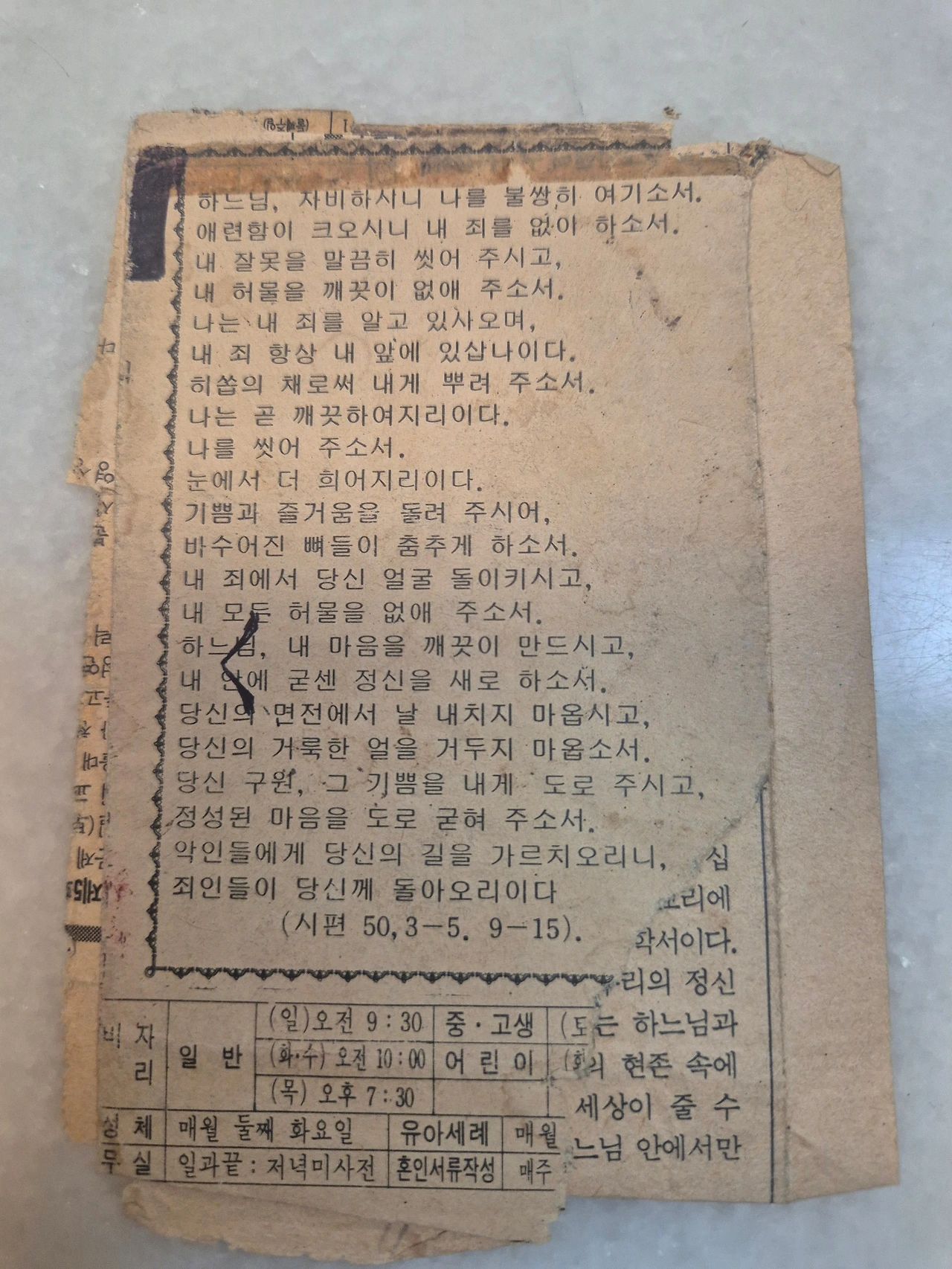 미사 중 주보에서 본 기도문은 나의 외침이었다. 가슴이 막혀 입 밖으로 새어 나오지 못한 숨소리 같았다. 눈물 콧물을 흘리며 미사를 마치고 나오는 길에 십자가와 성모상을 사서 자취방으로 돌아왔다. 기도문을 고이 접어 가슴에 품고 다녔다. 사람과 일에서 받은 상처로 만신창이가 되어 차가워지는 심장을 데워주었다. 그날이 11월이었으리라.