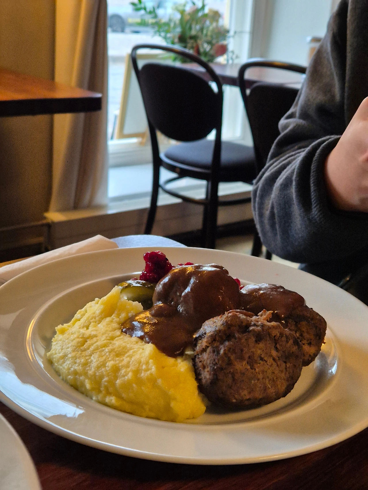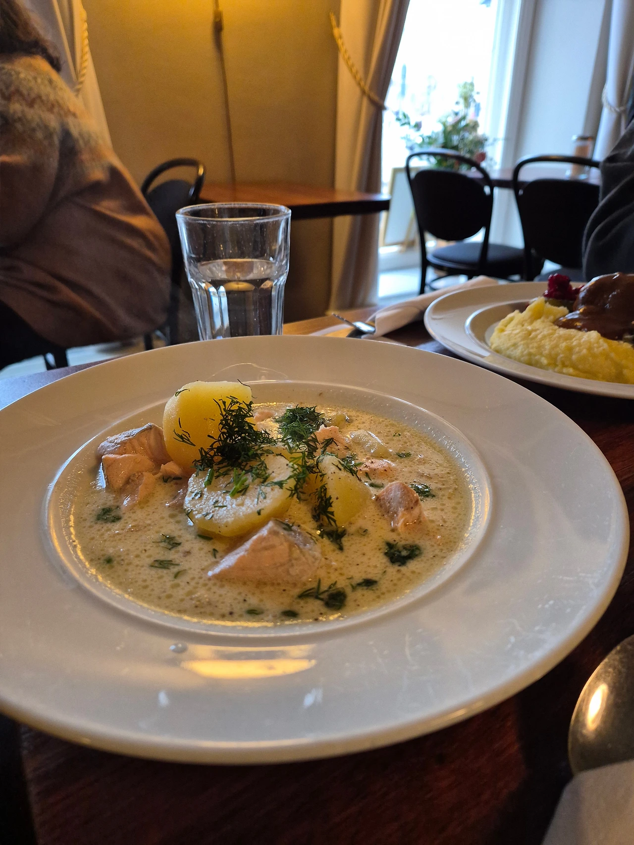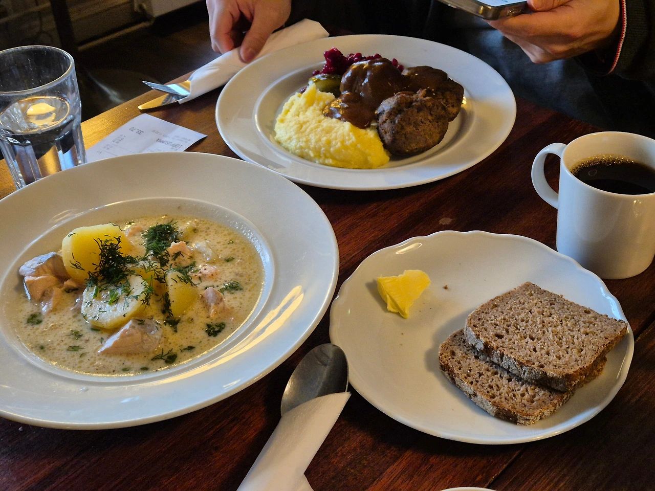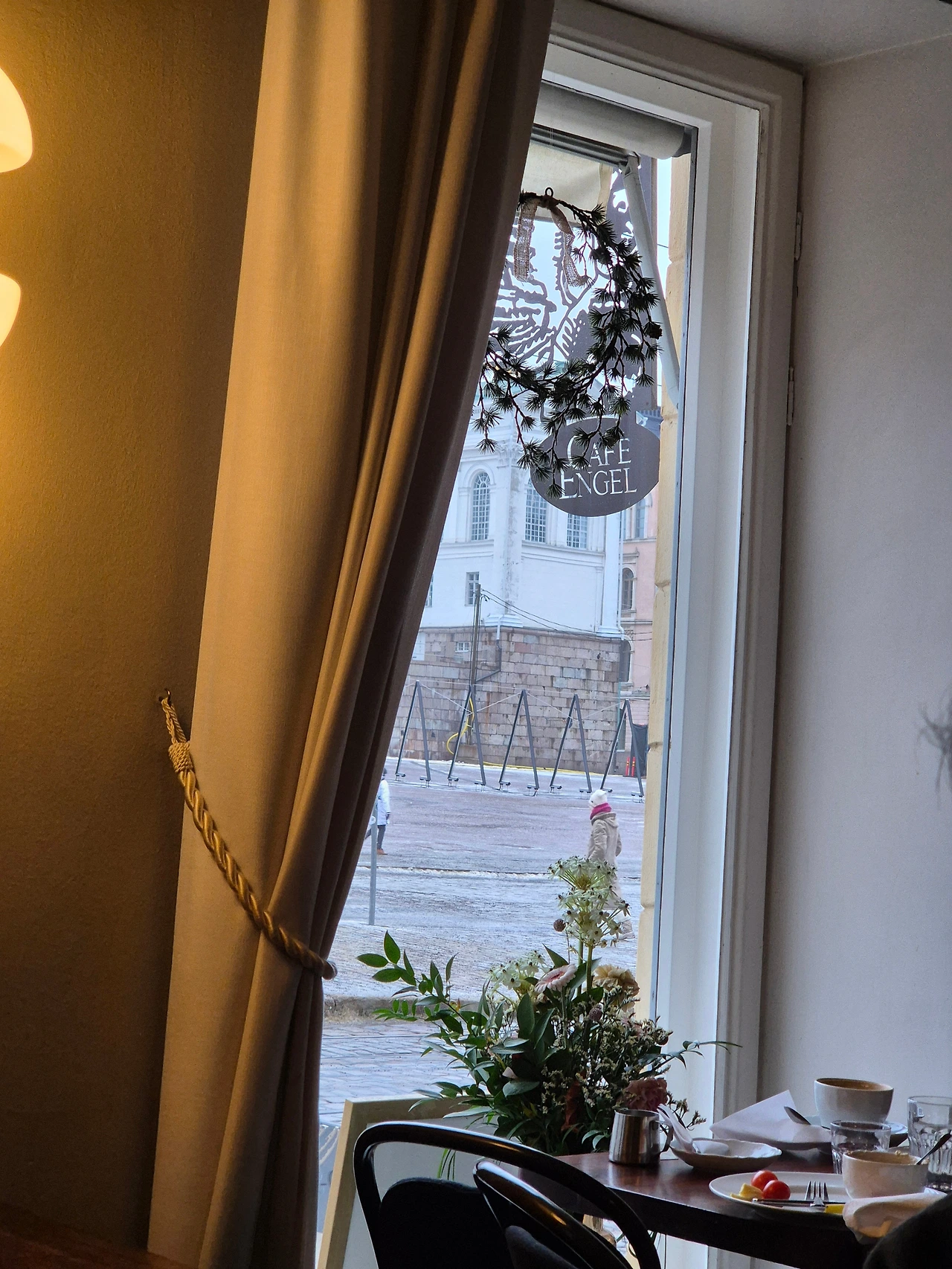 점심 식사를 위해 헬싱키 대성당 앞에 있어 뷰 맛집 cafe ANGEL로 갔다. 이곳은 헬싱키 연어수프 맛집으로도 유명하다. 흐리고 차가운 공기를 가르고 들어간 곳은 아늑했다. 탁자마다 놓여 있는 꽃들이 바깥날씨와 대조적이었다. 커피와 함께 한 미트볼과 연어수프는 카페 분위기에 어울리는 메뉴였다. 엄마의 손맛 같은 자극적이지 않은 맛에 여행의 마지막 식사로 기억에 남는다. 며늘아기는 드디어 마음에 드는 연어수프를 먹었다고 엄지를 들며 만족해하였다.