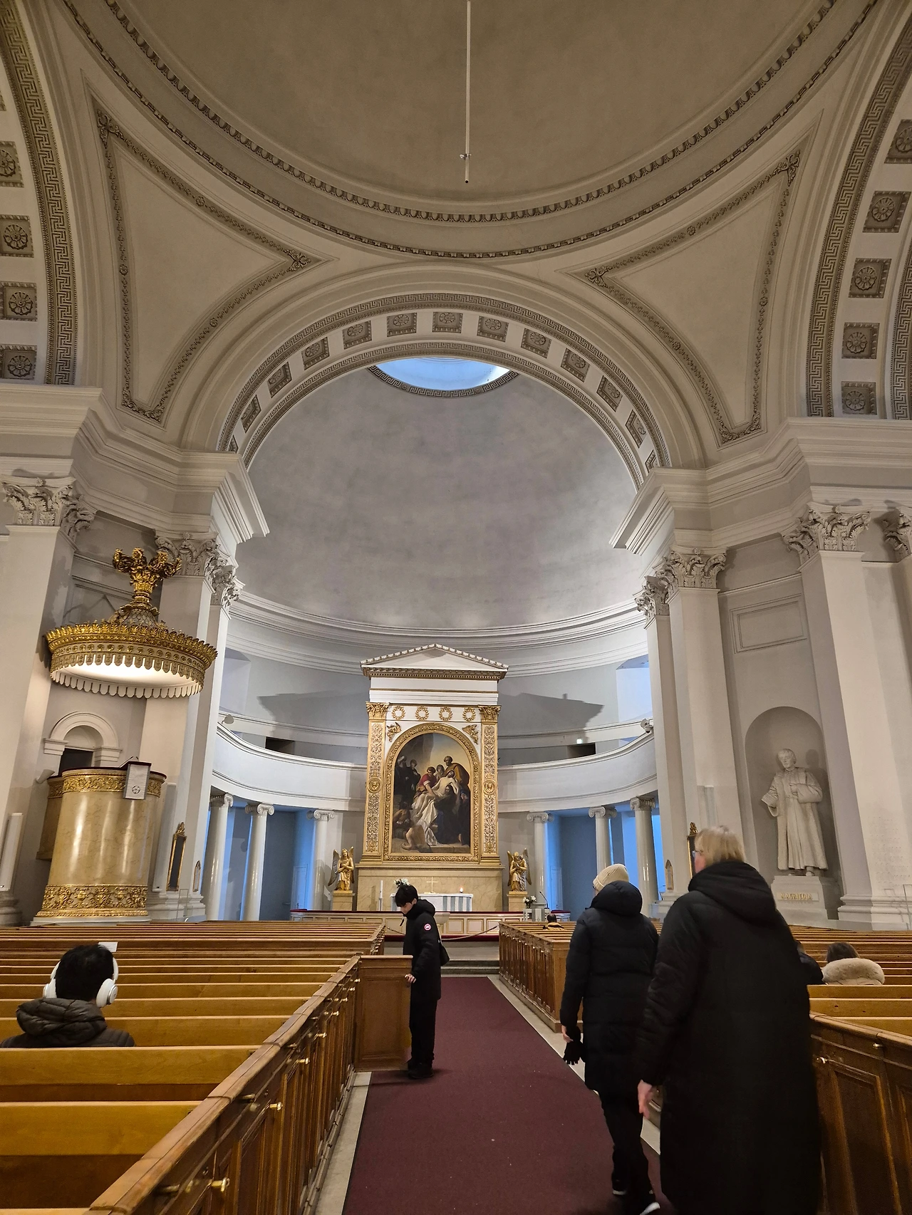 헬싱키의 랜드마크인 헬싱키대성당에 갔다. 성당 계단이 높아 한참 올라가야 했다. 러시아 정교회 대성당에서 루터교회성당으로 바뀌어 제단에 십자가가 없어 낯설었다. 우리는 성당 의자에 소리 없이 앉아 있었다. 어려운 겨울 핀란드 여행의 여정을 무사히 마칠 수 있었다고 보이지 않는 신께 감사를 드렸다. 성당을 나와 높은 곳에서 대성당 앞 원로원 광장을 내려다보았다. 찬 공기가 더 강하게 불고 광장에는 아무것도 없었다. 공허함 마저도 핀란드의 공기로 기억하고 싶었다. 광장은 정부청사. 대성당. 헬싱키대학교 본관, 중앙도서관이 둘러싸고 있다. 서울 시청 앞 광장 같은 공간으로 시민들의 만남의 장소로 이용된다고 한다.