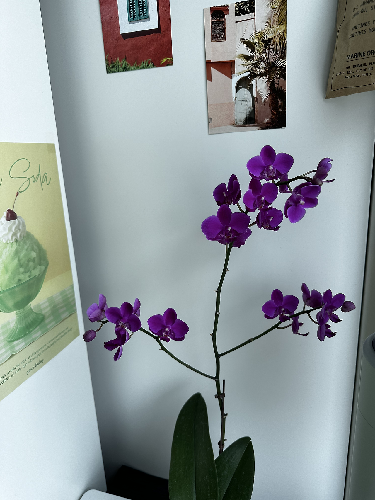 또 들이고 싶었던 건 꽃나무였는데, 그 중에서도 호접란을 키우고 싶었다. 몇년 전 밀라노에서 방문했던 이탈리아인 친구 집 곳곳에 난을 키우고 있었다.(일회용 플라스틱 컵에 무심하게 심겨진 채). 내 기준 호접란은 값비싼 식물이어서, 이탈리아인 친구의 호접란에 대한 쿨한 태도가 꽤나 멋지게 느껴졌고, 언젠가는 나도 무심히 난꽃을 키워보고 싶었다. 어느 주말 집 근처를 걷다가 길에서 5천원에 파는 호접란을 만나게 됐고, 그렇세 진한 핑크색 꽃송이가 꽤나 많이 달린 [호접]을 들이게 됐다. 선배가 승진했을 때 근사하게 보내던 꽃이었는데, 단돈 5천원에 우리집에 온 호접.
