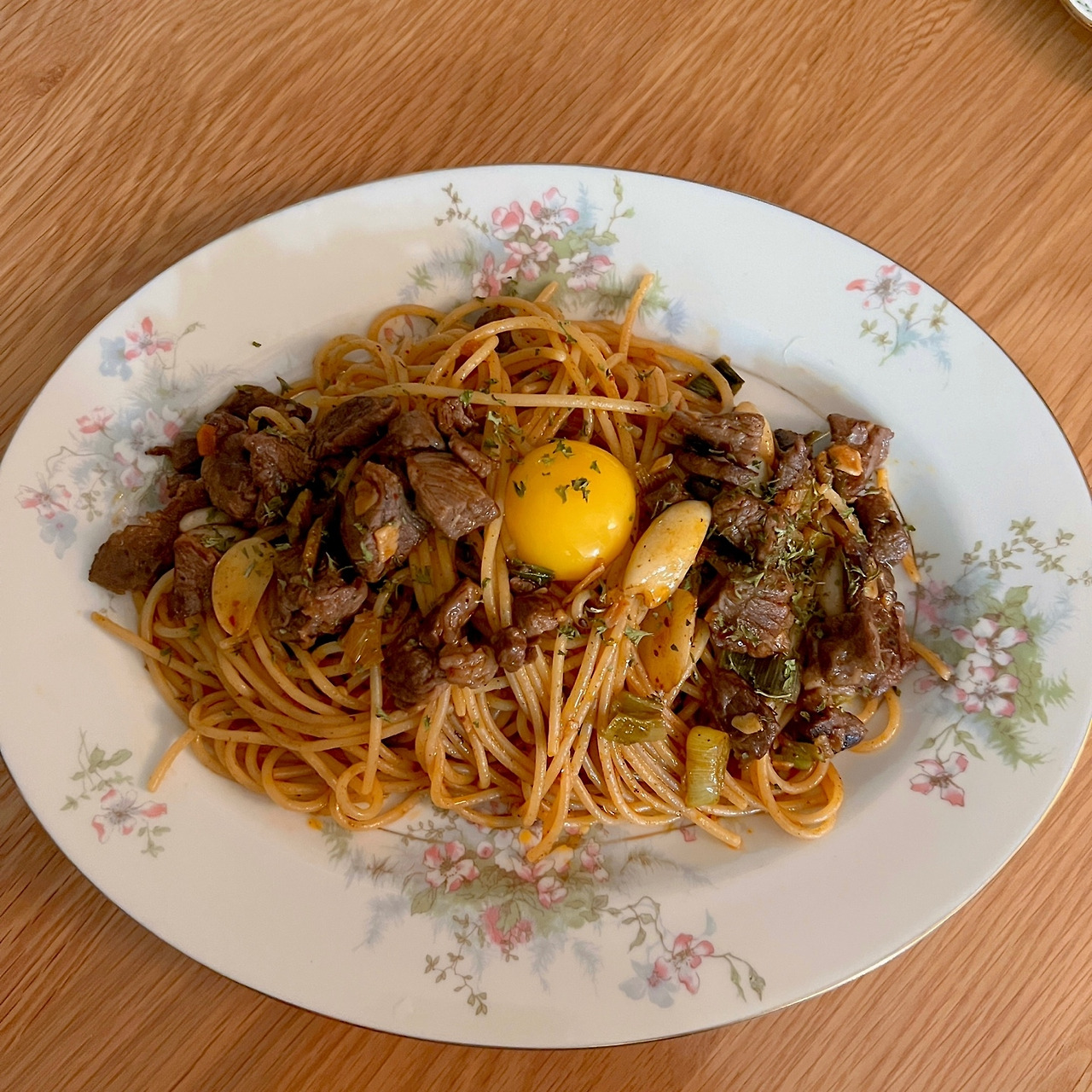 매콤한 듯 새콤하게 맛있는 소고기라유파스타와 간단한 와인 안주.
