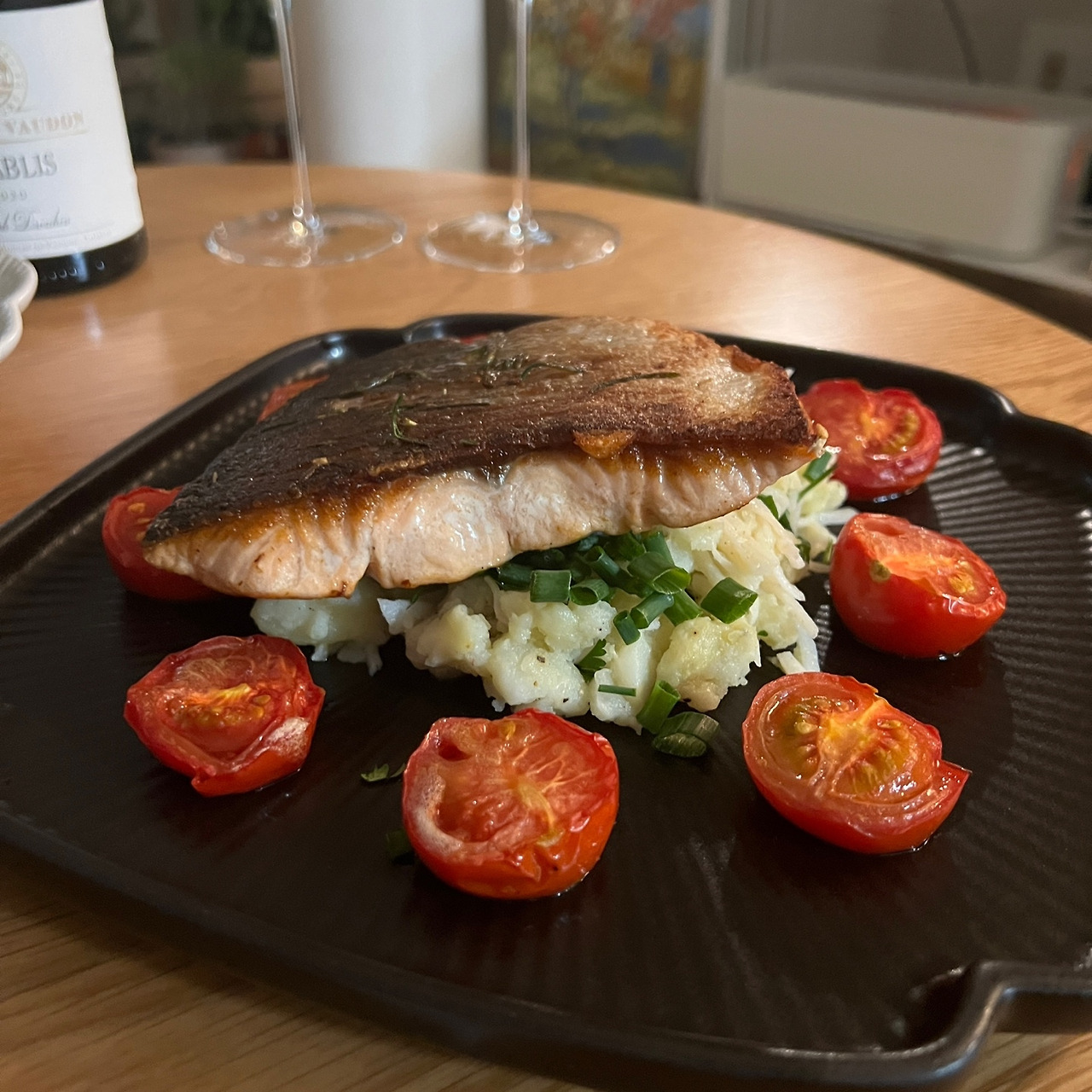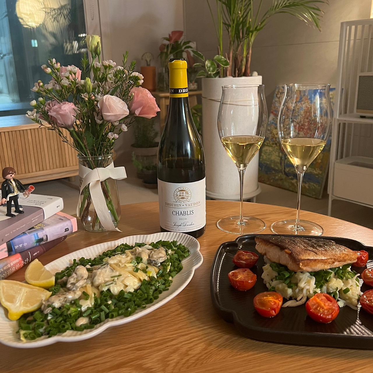 완성된 굴크림파스타와 연어스테이크, 그리고 샤블리입니다.
