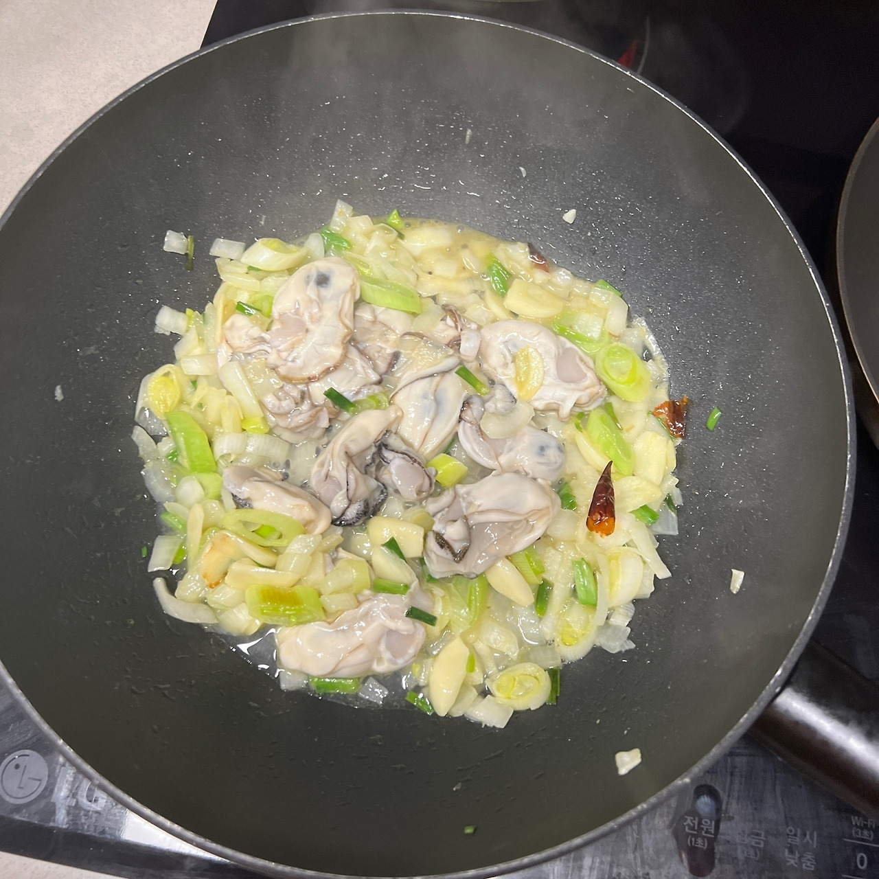 마늘이 노릇해질 때쯤 씻어둔 굴을 넣고, 화이트 와인 종이컵 반 정도 넣어 비린내를 잡고 풍미를 더해줍니다.
