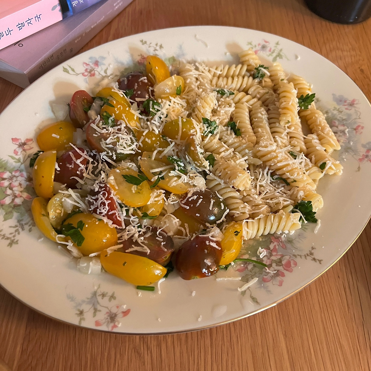 잘익은 푸실리 파스타면을 그릇에 담아내고 소스와 섞어둔 토마토를 곁들이면 새콤달콤 건강한 토마토파스타 완성입니다.