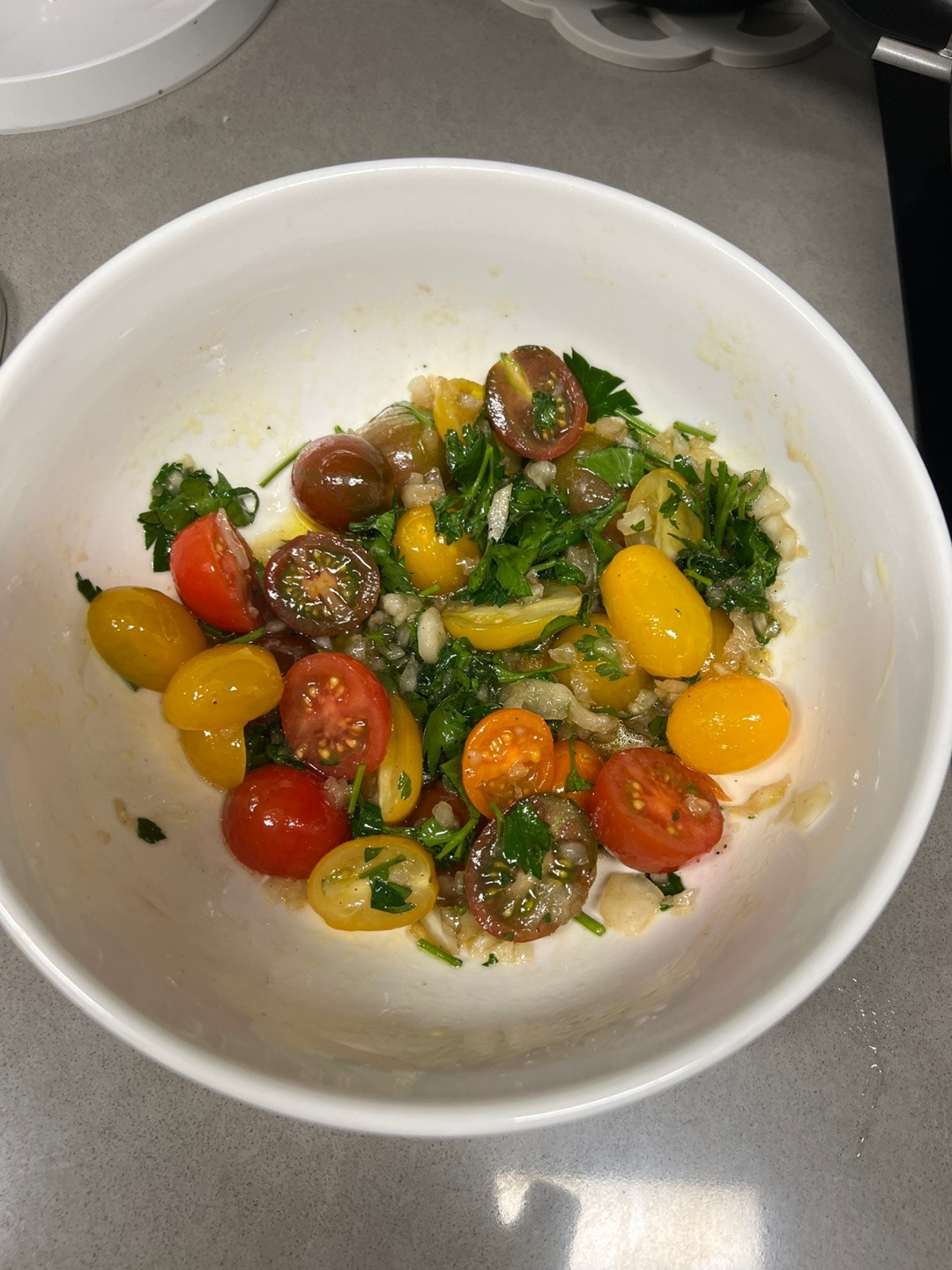 집에서 키우고 있는 각종허브를 요리에 활용하고자 각종 허브, 다진양파, 방울토마토, 올리브오일 등을 활용하여 토마로 마리네이드를 한 후에 파스타를 삶아 함께 먹는다면 상큼하고 정말 맛있습니다.