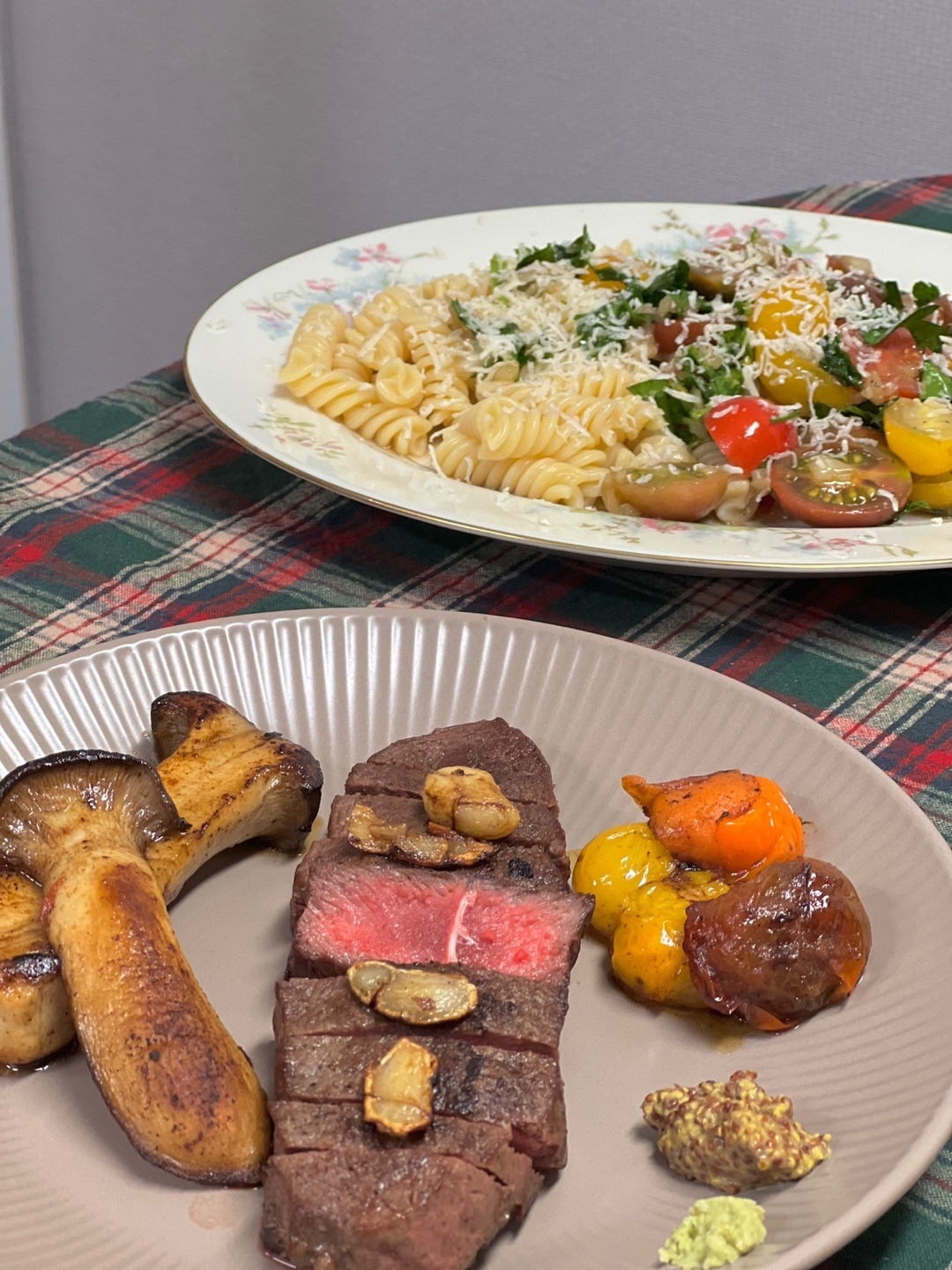 완성된 토마토마리네이드 파스타와 스테이크 입니다!