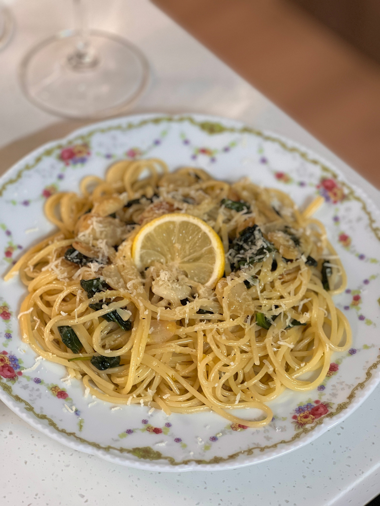 시원하게 칠링 된 피노 그리지오와 취나물엔초비파스타, 닭다리살 구이까지!