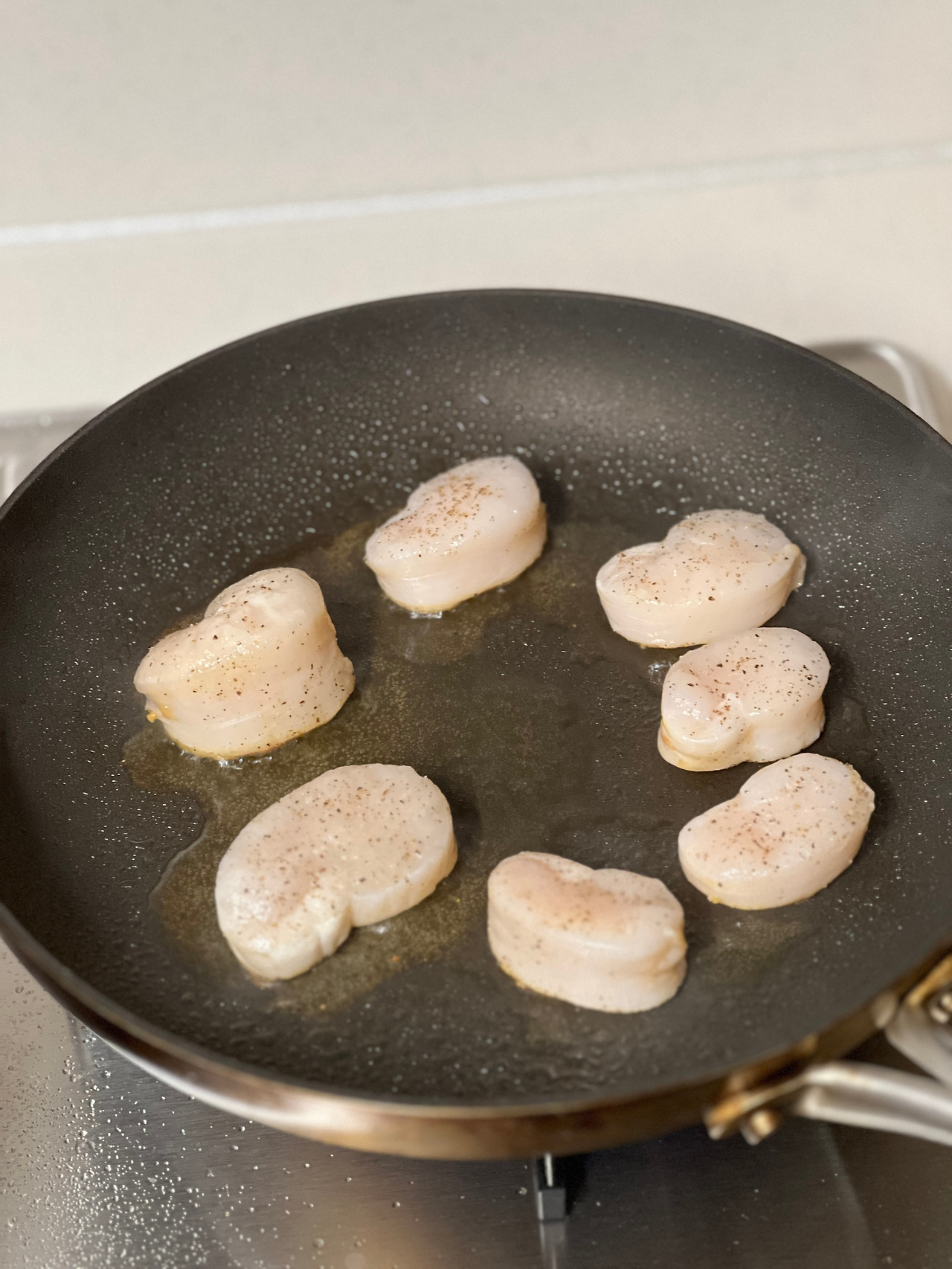 오일을 두른 팬에 소금, 후추로 시즈닝한 관자를 구워냅니다.
