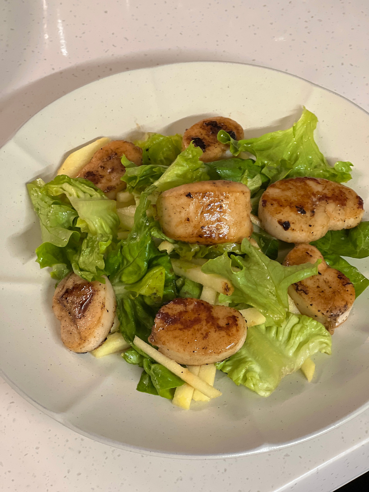 샐러드와 채 썬 사과 그리고 구워낸 관자를 올린 후 상큼한 레몬즙과 레몬제스트를 추가합니다.