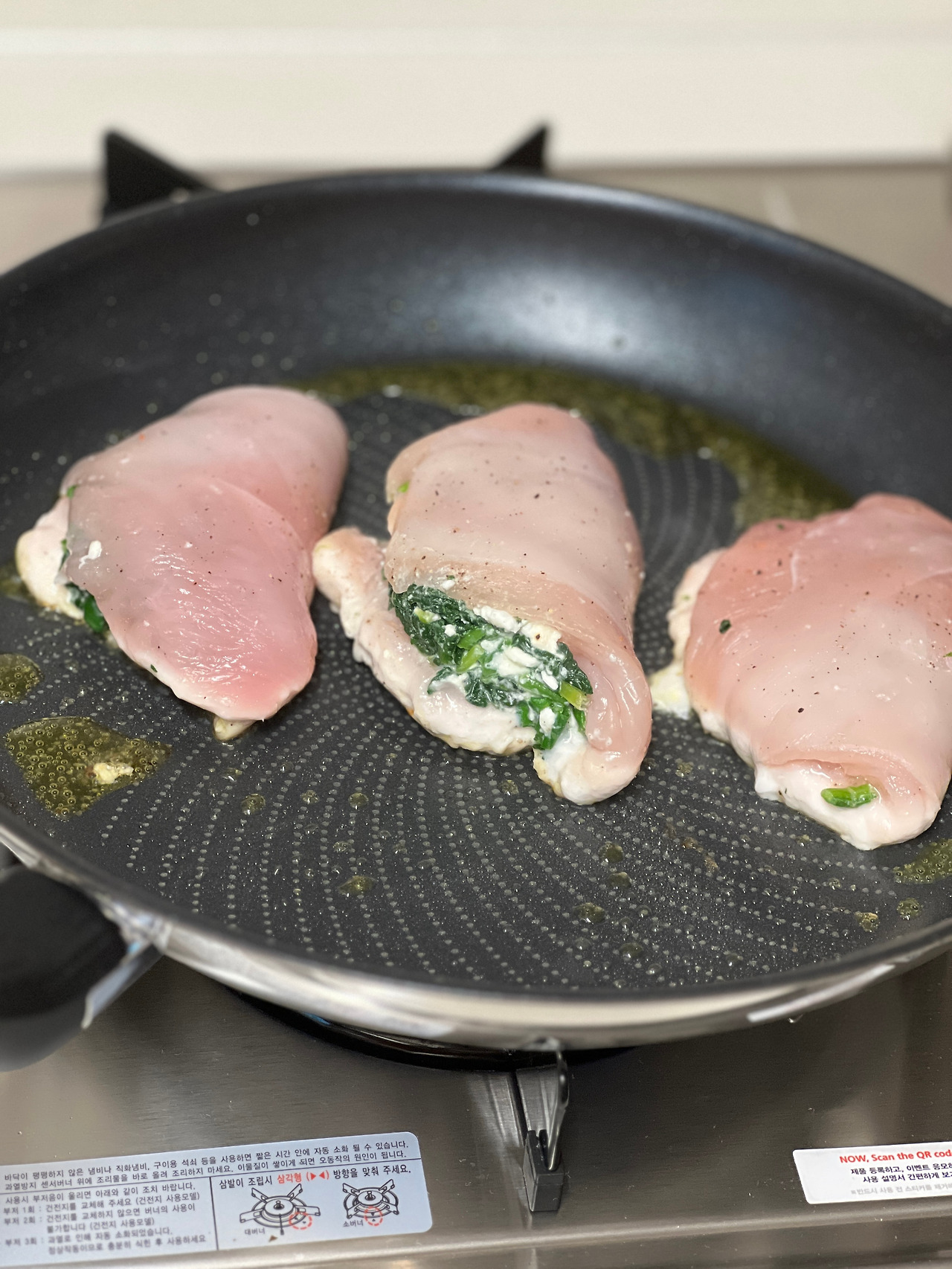 닭가슴살을 고기망치로 두들겨서 얇게 펴낸 후 버무린 시금치와 페타치즈를 속에 넣고 반 접어둡니다.