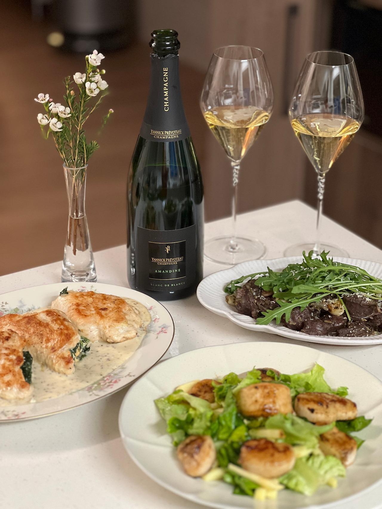 봄을 담은 저녁을 소개해드리려고 해요. 싱싱한 제철의 시금치와 페타치즈를 함께 닭가슴살에 넣고 맛있게 구워낸 스피니치 치킨과 상큼한 레몬제스트를 포인트로 한 관자샐러드, 루꼴라를 곁들인 바질순대 그리고 더없이 잘 어울릴 샴페인이 오늘의 주인공입니다.