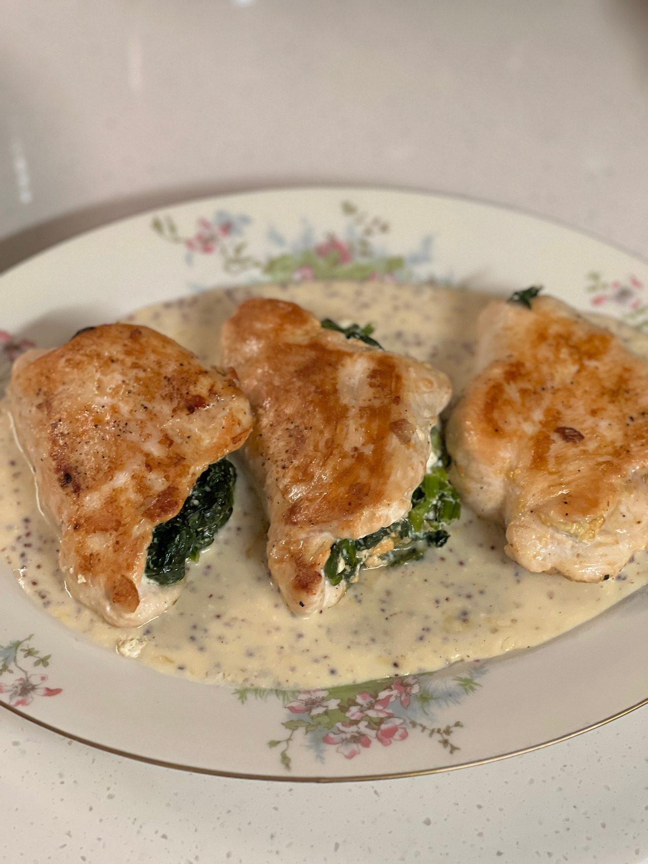 크림소스와 홀그레인 머스타드를 섞어 곁들일 소스를 만들어 그릇에 덜어두고 구워진 스피니치 치킨을 올려 마무리합니다.