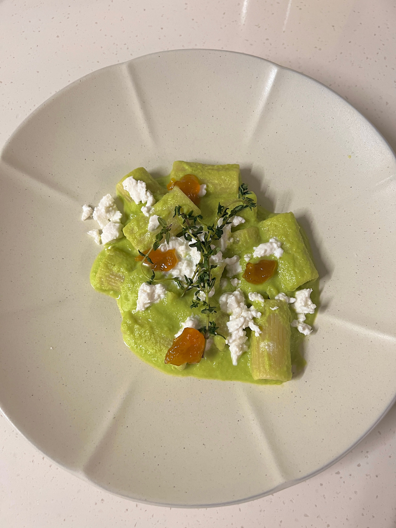 잘 익은 리가토니면을 완두콩소스와 잘 섞어주신 뒤 그릇에 올려내고 페타치즈와 살구쨈을 살짝 얹어줍니다.