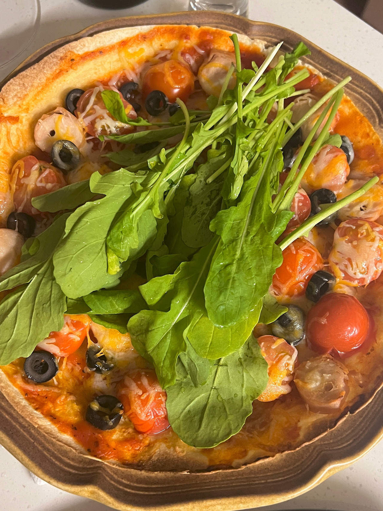 마지막으로 루꼴라를 한가득 올려주시면 집에서 먹는 피자 완성입니다.