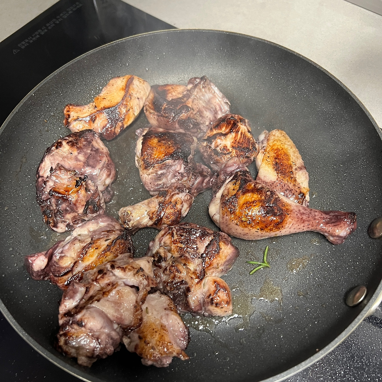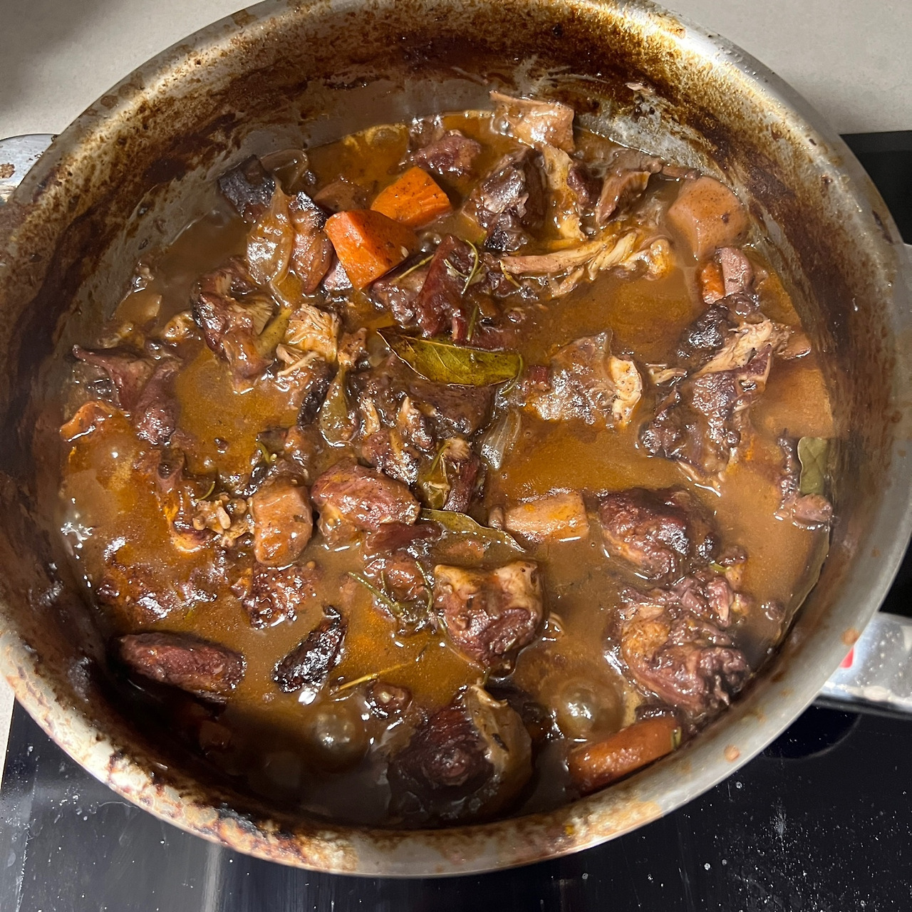 꼬꼬뱅은 닭고기를 레드와인에 재우고, 들어갈 야채와 함께 팬에 한번 굽고, 모든 재료를 냄비에 넣은 뒤 중간중간 냄비를 열어 얼마나 졸여졌는지 확인만 하시면 얼추 끝나는 간단하고 쉬운 편에 속합니다.