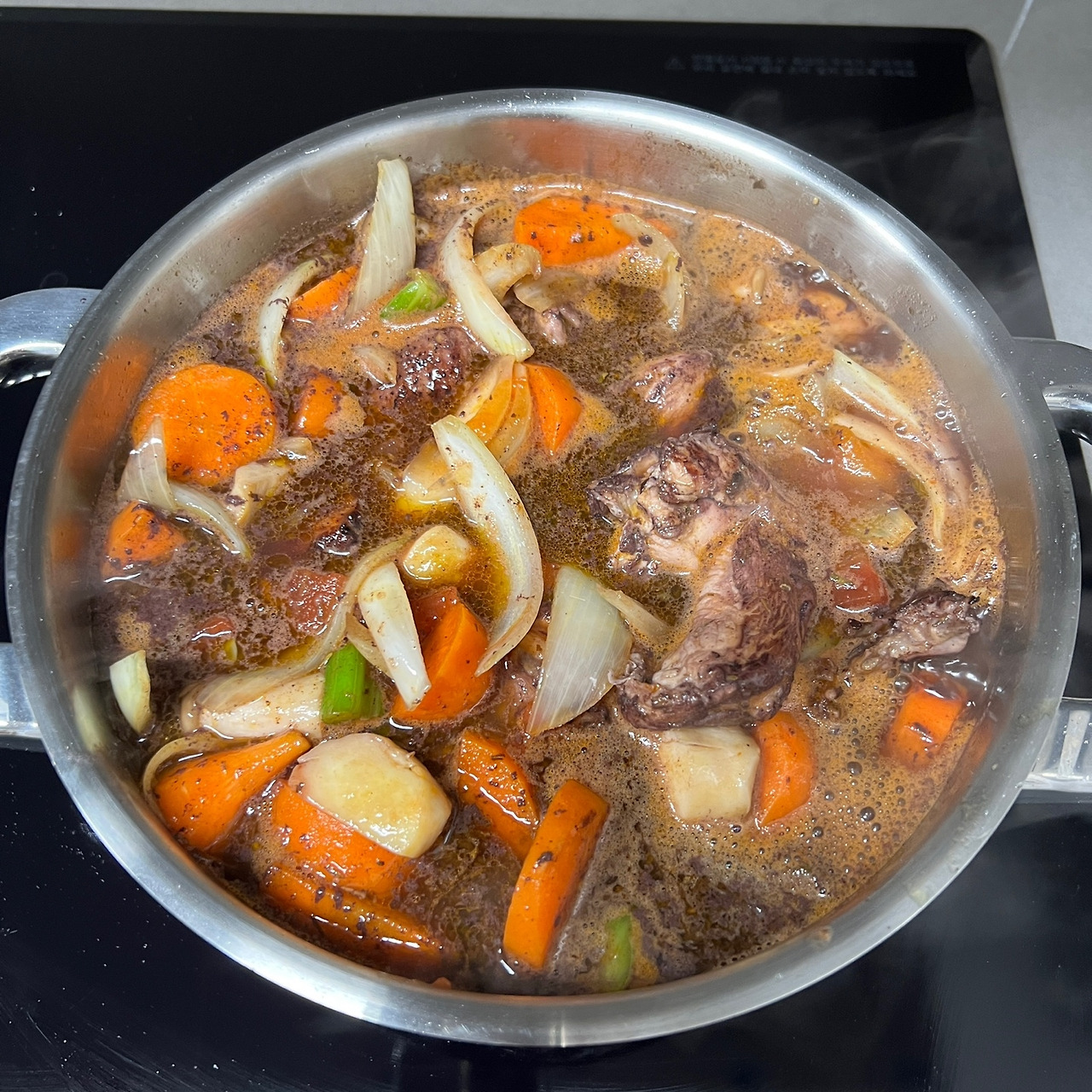 어느 정도 익힌 재료는 치킨스톡을 푼 물에 따로 빼둔 레드와인과 함께 끓입니다.
