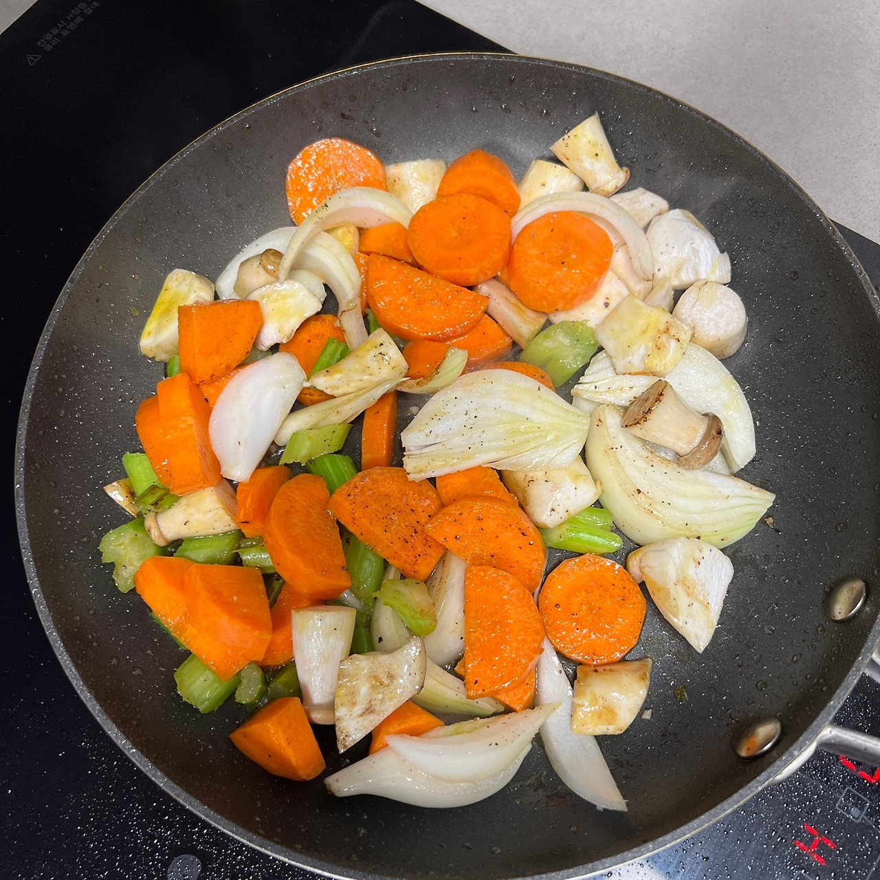 냄비 속에서 꺼내 팬에 한번 볶아줍니다. 이때 레드와인은 버리지 않고 따로 보관해둡니다.