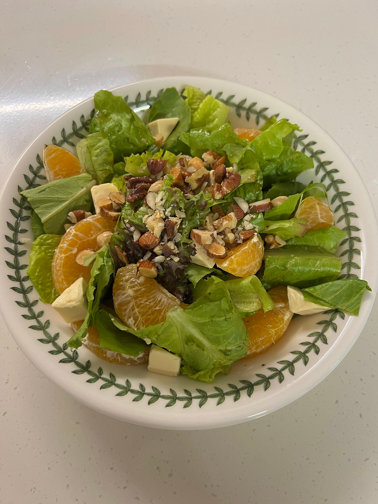 샐러드용 채소를 보울에 넣고, 중간중간 한라봉과 큐브치즈를 넣어줍니다.