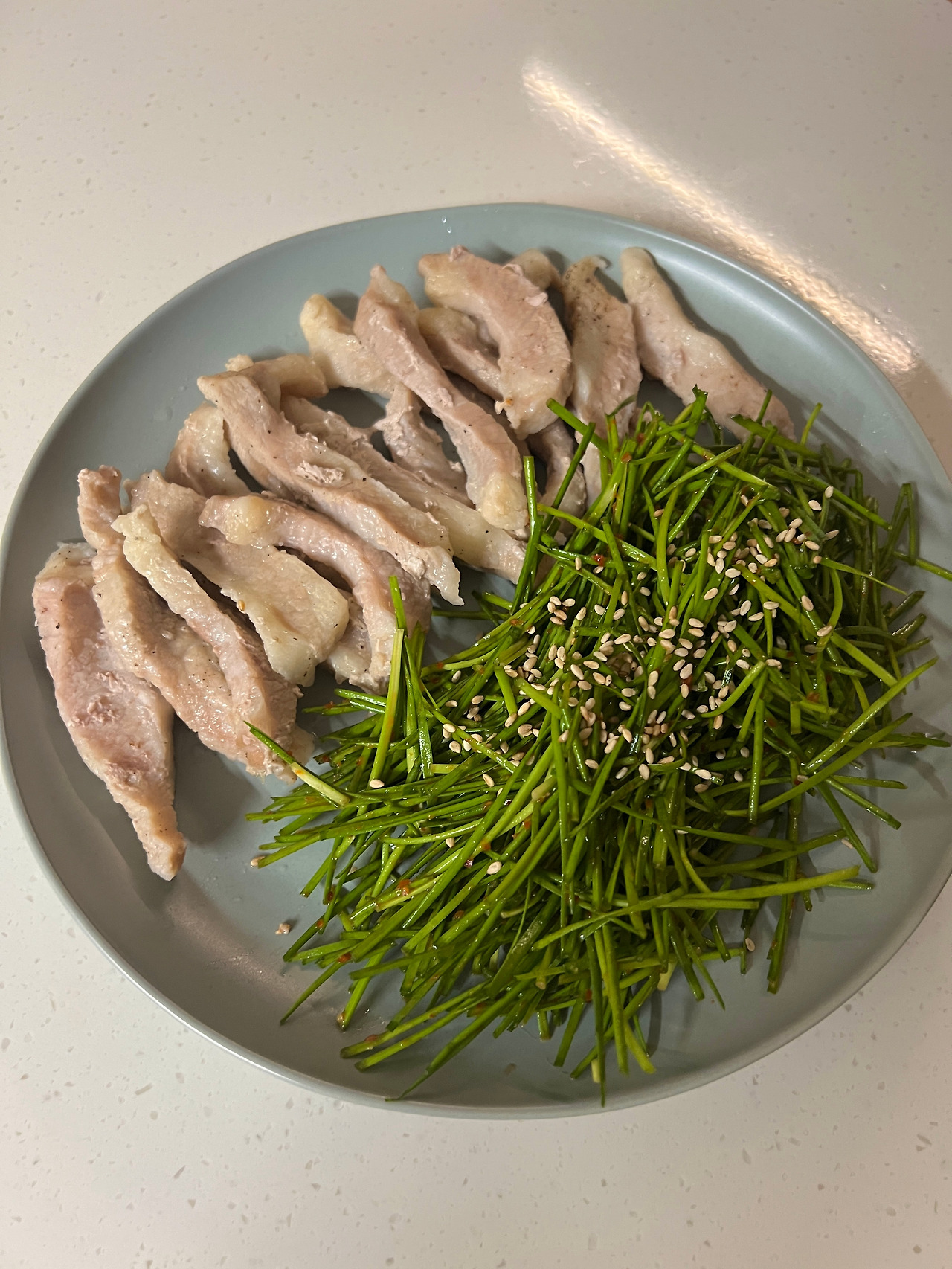 항정살수육과 영양부추무침 그리고 미소된장버섯파스타예요 :)