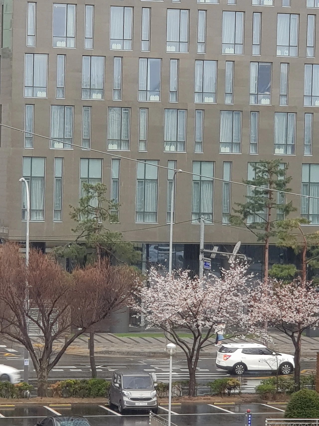 그렇게 1주일을 걸었다. 수술 후 60kg까지 늘어나던 몸무게는 매일 걷는 것만으로 55kg대로 내려갔다. 변비 해결은 당연. 체중이 많이 빠진 건 사실인데 몸은 가볍다. 걷기로 다리에 힘도 생기고. 아이러니한 건 잃었던 밥맛까지 병원에서 찾았다는 것. 병원밥이 맛있을 줄 어떻게 알았겠나. 밥과 국, 메인 고기반찬은 손이 덜 가고, 세 가지 야채 반찬을 주로 먹는다. 생선은 먹는다. 요즘은 친정 엄마가 매일 현미밥과 미역국과 나물을 한 가지씩 언니 편으로 보내주신다. 엄마의 음식을 먹자 병원밥에 손이 가지 않았다. 병원이 언니 집에서 멀지 않아 다행이었다. 아직까지 해결 못한 건 잠이다. 입원 후부터 깊이 잠들지 못하고 있다. 어제는 수면제 반 알을 처방받고 5시간 가까이 잤다. 얼마나 개운하던지! 오늘 새벽에는 탕비실에 따뜻한 물을 받으러 갔다가 열린 창문으로 빗소리를 들었다. 어찌나 듣기 좋던지! 내 침대 창 밖 대로에는 벚꽃도 피었다.