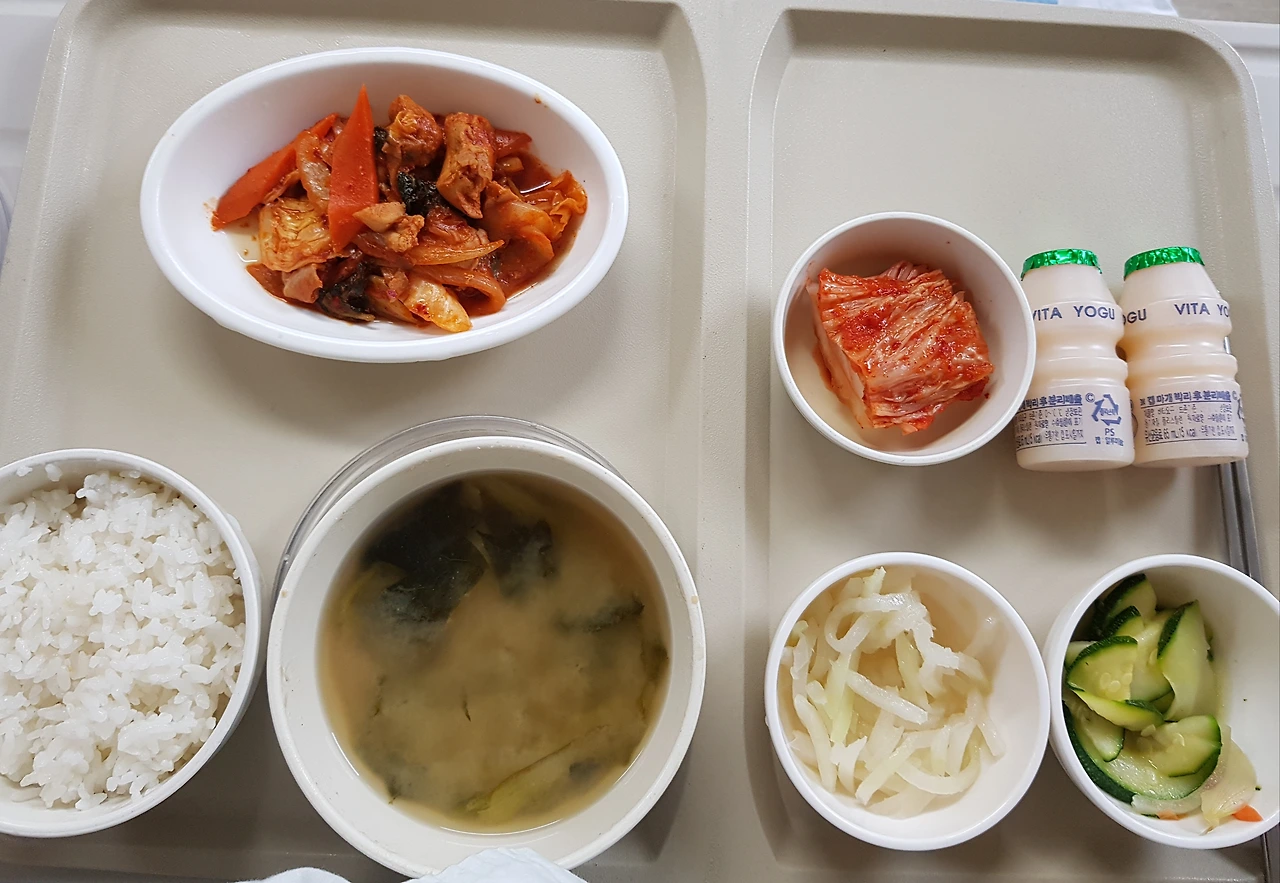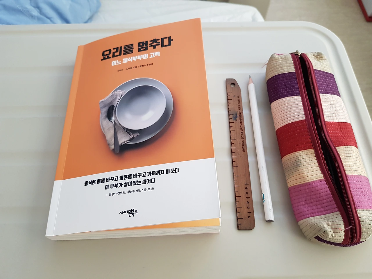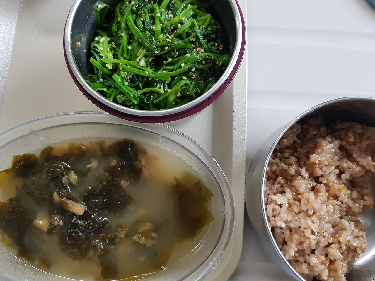 채식에 관한 책을 읽고 있다. 채식 이후 부모님의 관절염과 아이들의 ADAH가 나았다는 사례에는 진심으로 놀랐다(위). 병원밥과 친정 엄마가 보내신 현미밥과 미역국과 나물(아래).