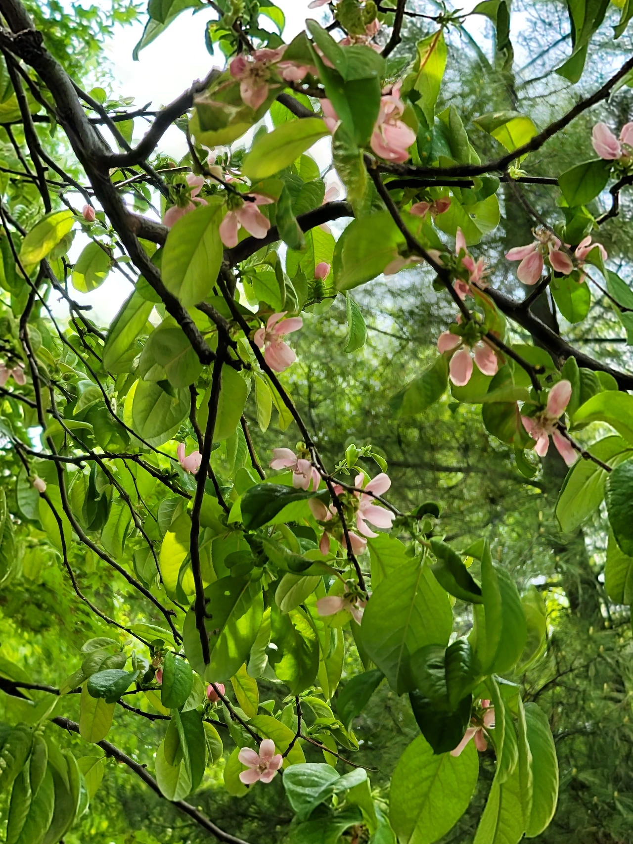 내가 매일 산책을 나가는 동네 공원에 모과나무 두 그루가 있다. 하나는 엄청 크고 다른 하나는 조금 크다. 내가 이 나무를 눈여겨본 건 오래됐는데 예쁜 꽃 때문이었다. 공원 이쪽 편의 모과나무 꽃과 저쪽 편의 명자나무 꽃이 올봄 나의 재발견이라 해도 과언이 아닐 정도로. 명자꽃의 이름을 물어보자 우리 샘이 모과꽃이 아닐까 하신 적은 있다. 사진까지 보내주시면서. 그때도 눈치를 채지 못했다. 반대편의 그 꽃임을. 이번에 벗들이 다녀가며 제대로 알았다. 모과나무는 나무 색깔부터 다르다는 것을. 미안하지만 모과만 보면 결코 연상되지 않는 작고 어여쁜 꽃. 그러니 어찌 상상이나 했겠는가.