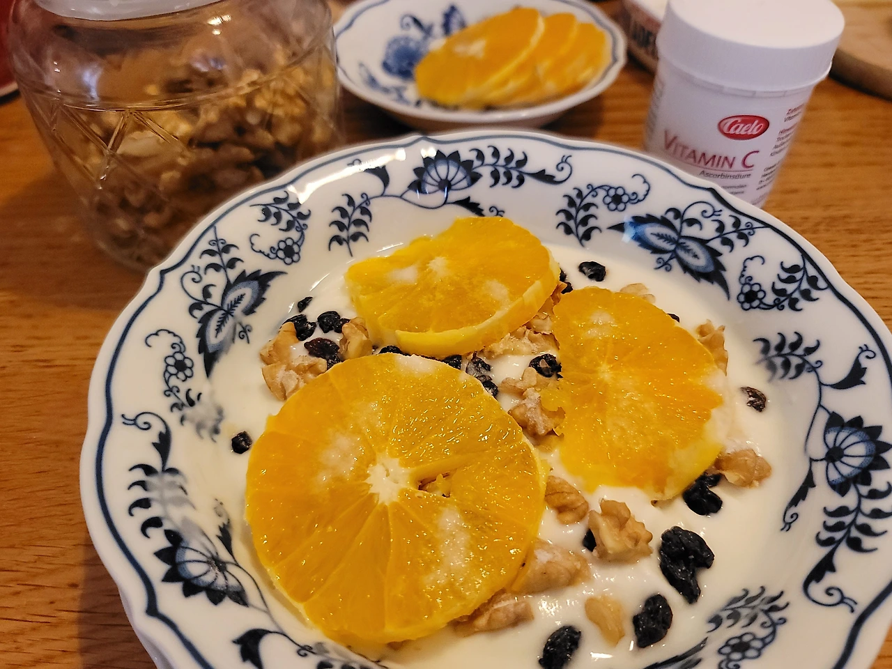 2021.5.1 주말 아침의 게으름. 아침에는 플레인 요구르트에 견과류와 과일, 분말 비타민 C를 뿌려먹는다(위/가운데).