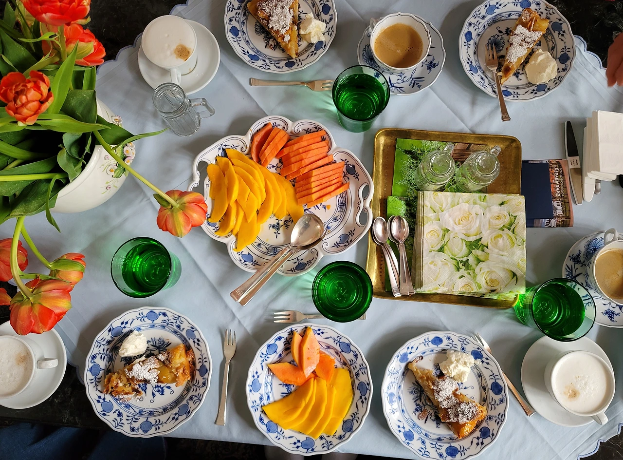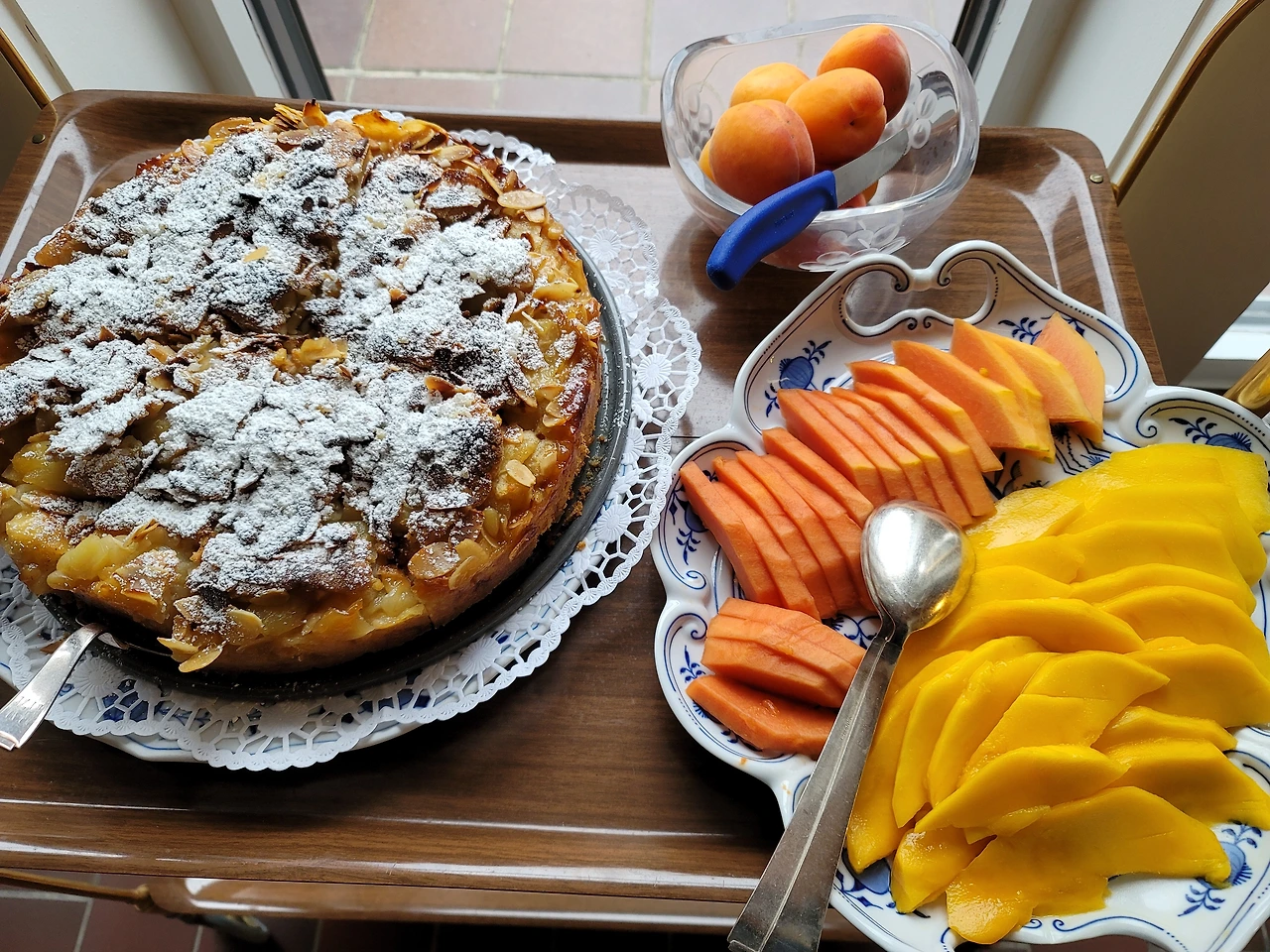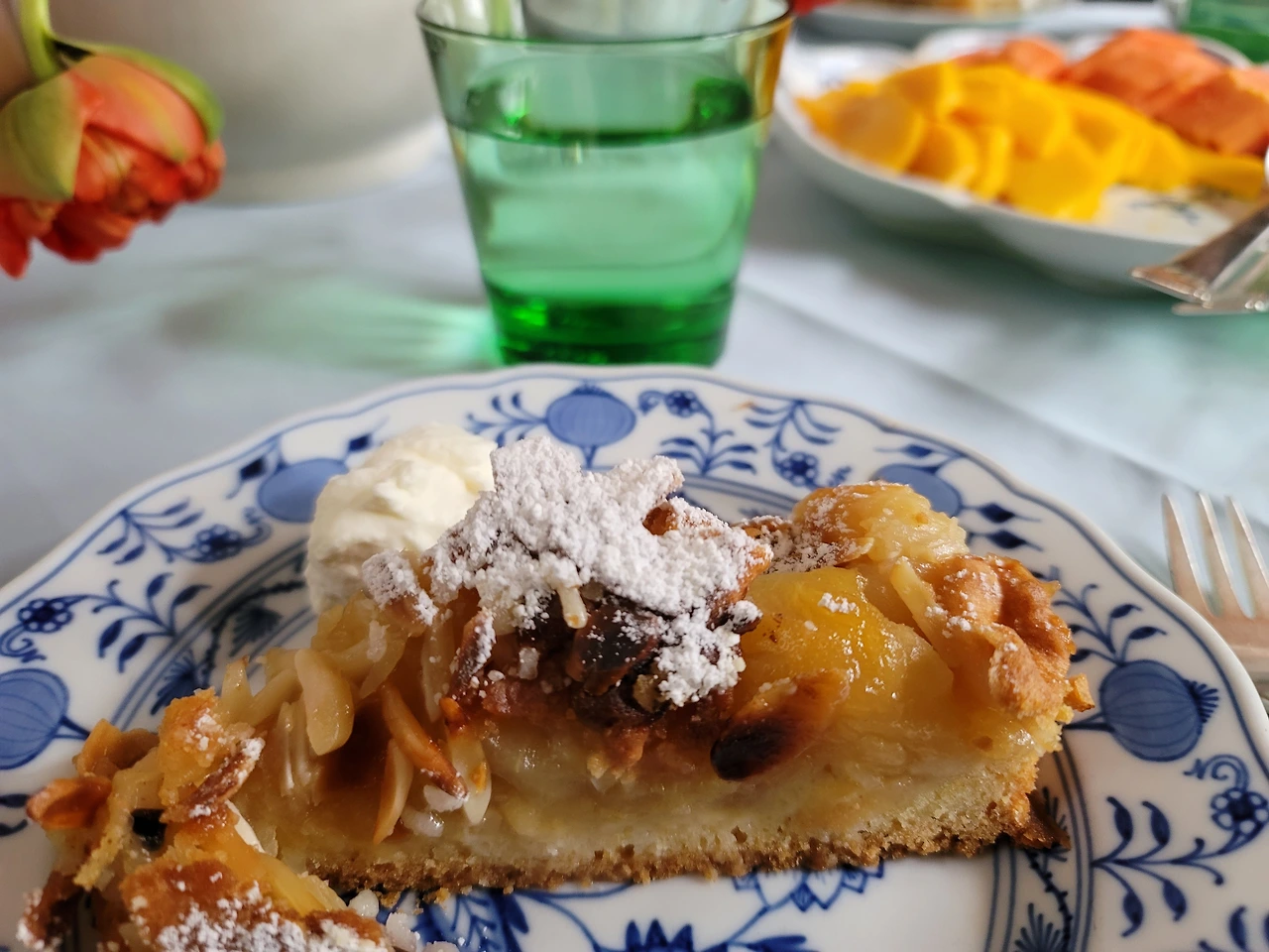 눈도 즐겁고 입도 즐거운 오후의 티타임. 카타리나 어머니의 애플 쿠헨과 나를 위해 준비하신 과일은 망고와 파파야. 어머니를 위해 산 작약.