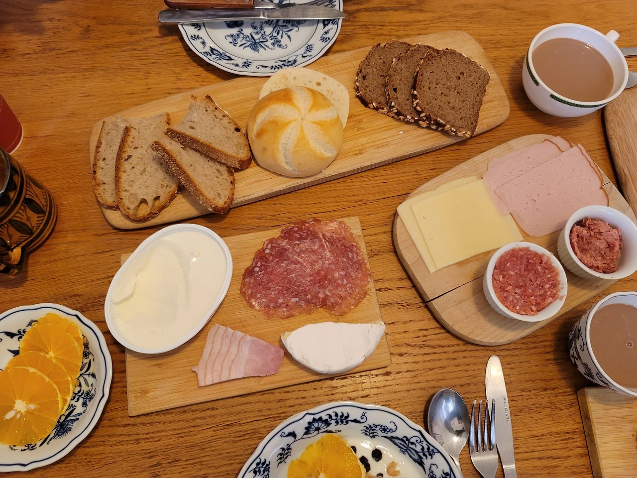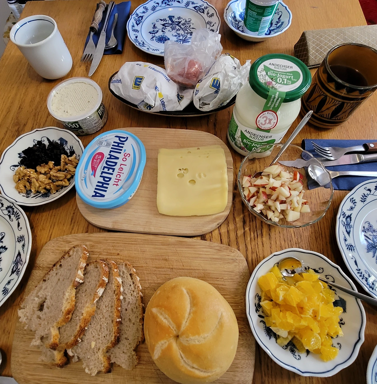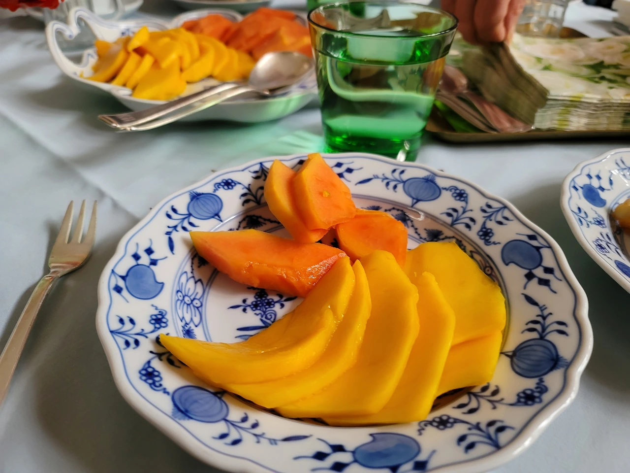 눈도 즐겁고 입도 즐거운 오후의 티타임. 카타리나 어머니의 애플 쿠헨과 나를 위해 준비하신 과일은 망고와 파파야. 어머니를 위해 산 작약.