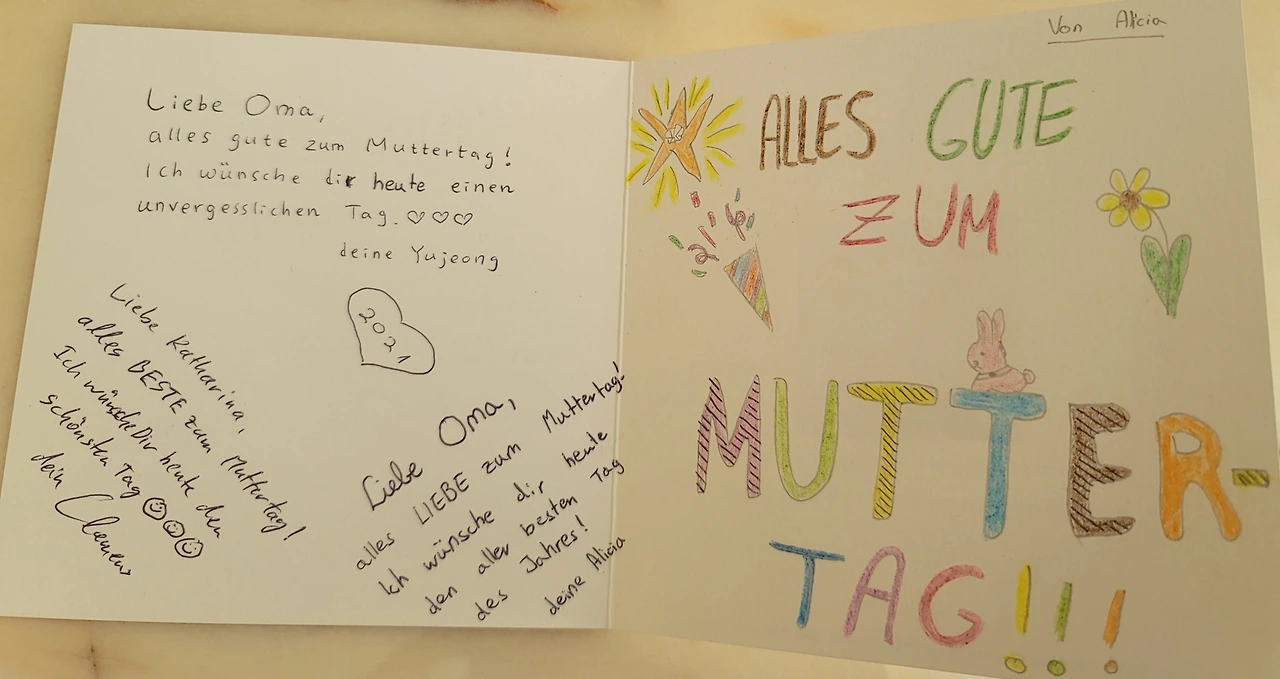 독일의 어머니날인 무터 탁 Muttertag에는 카타리나 어머니를 찾아뵈었어요. 카드는 금요일에 미리 받으셨고요. 카드의 절반은 클레멘스와 알리시아와 제가 축하 메시지를 나눠 쓰고, 절반은 알리시아에게 그림을 부탁했죠. 축하 글이 그렇잖아요. 특별할 게 있나요. 어머니날 축하드려요. 멋진 하루 보내시길요. 끝. 그래도 좋아하셨어요. 힐더가드 어머니는 전화를 드릴 때마다 카드 얘기를 하신답니다. 요즘도 아침저녁으로 들여다보신다고요. 저도 알리시아에게 카드를 받았어요. 한국의 어버이날이 토요일이었어요. 한글학교 온라인 수업이 있는 날이라 다 같이 카드를 만들었나 봐요. 별 말은 없었어요. 사랑하는 엄마! 어버이날을 축하해. 알리시아가. 제가 항암을 하던 어제 알리시아는 친구 집에 파자마 파티를 가서 아직도 안 돌아왔답니다.