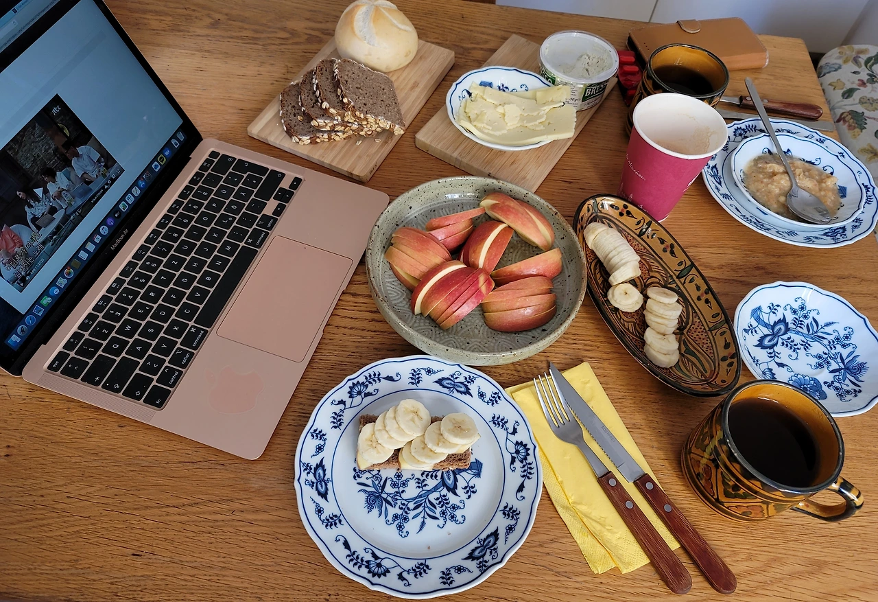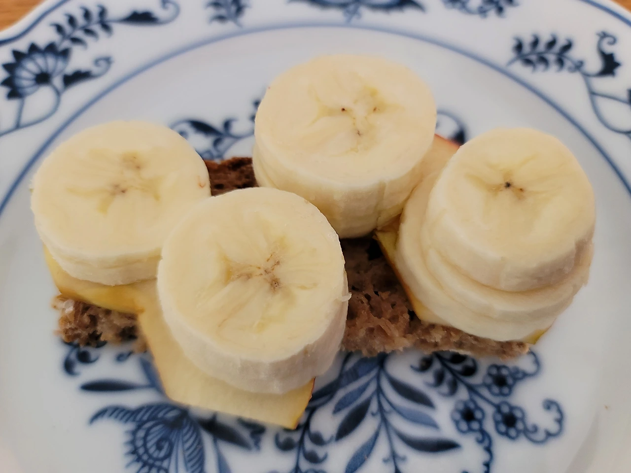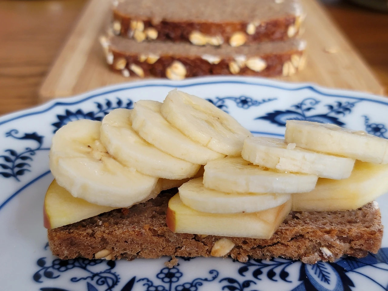 파파의 사랑은 아이를 위한 에그 버그와 망고(위) 나의 아침은 검은 빵 위에 사과와 바나나(아래). 주말도 밤낮도 없이 나를 케어하는 언니를 위해서는 아침부터 유명가수전 재시청.