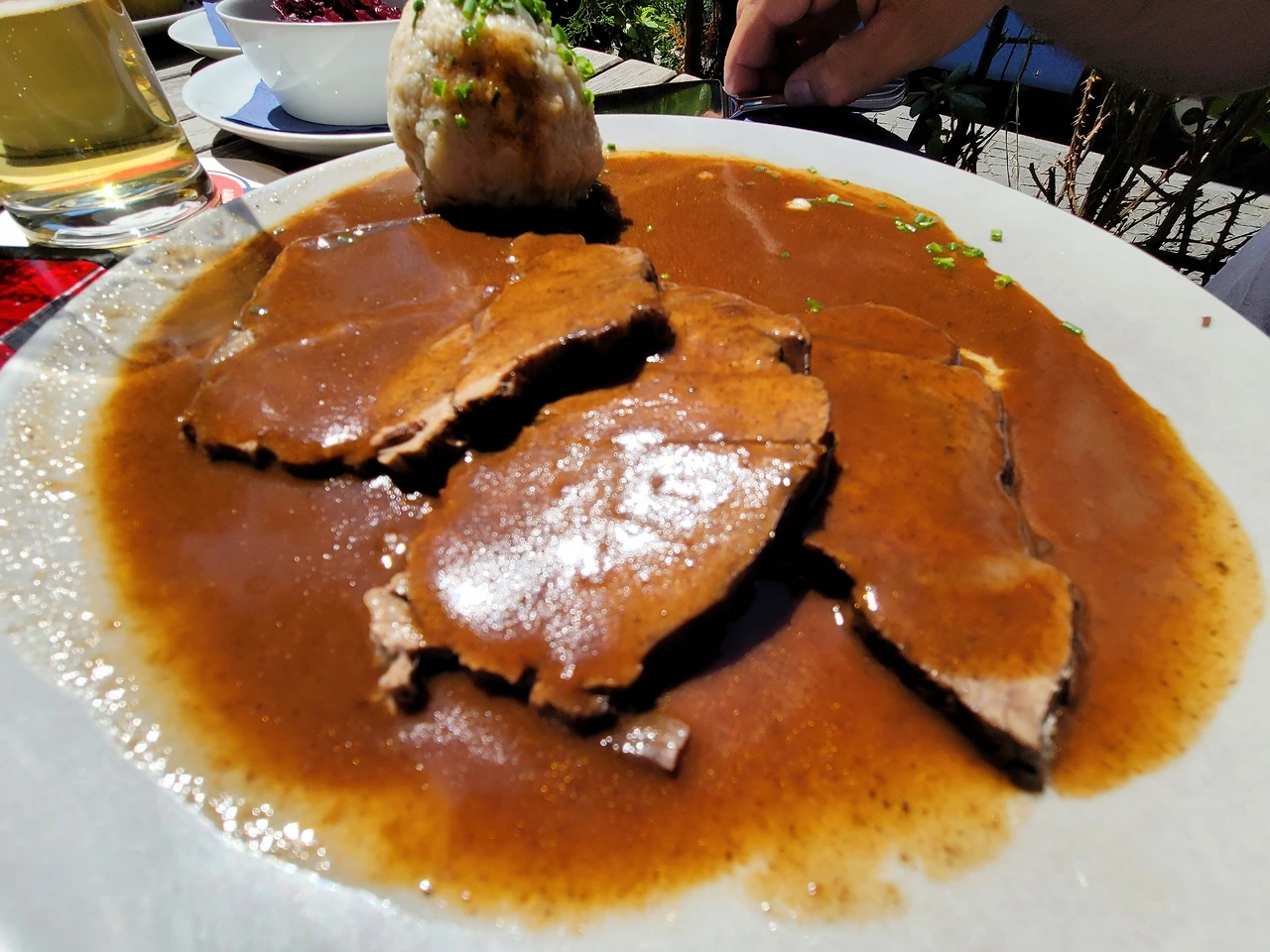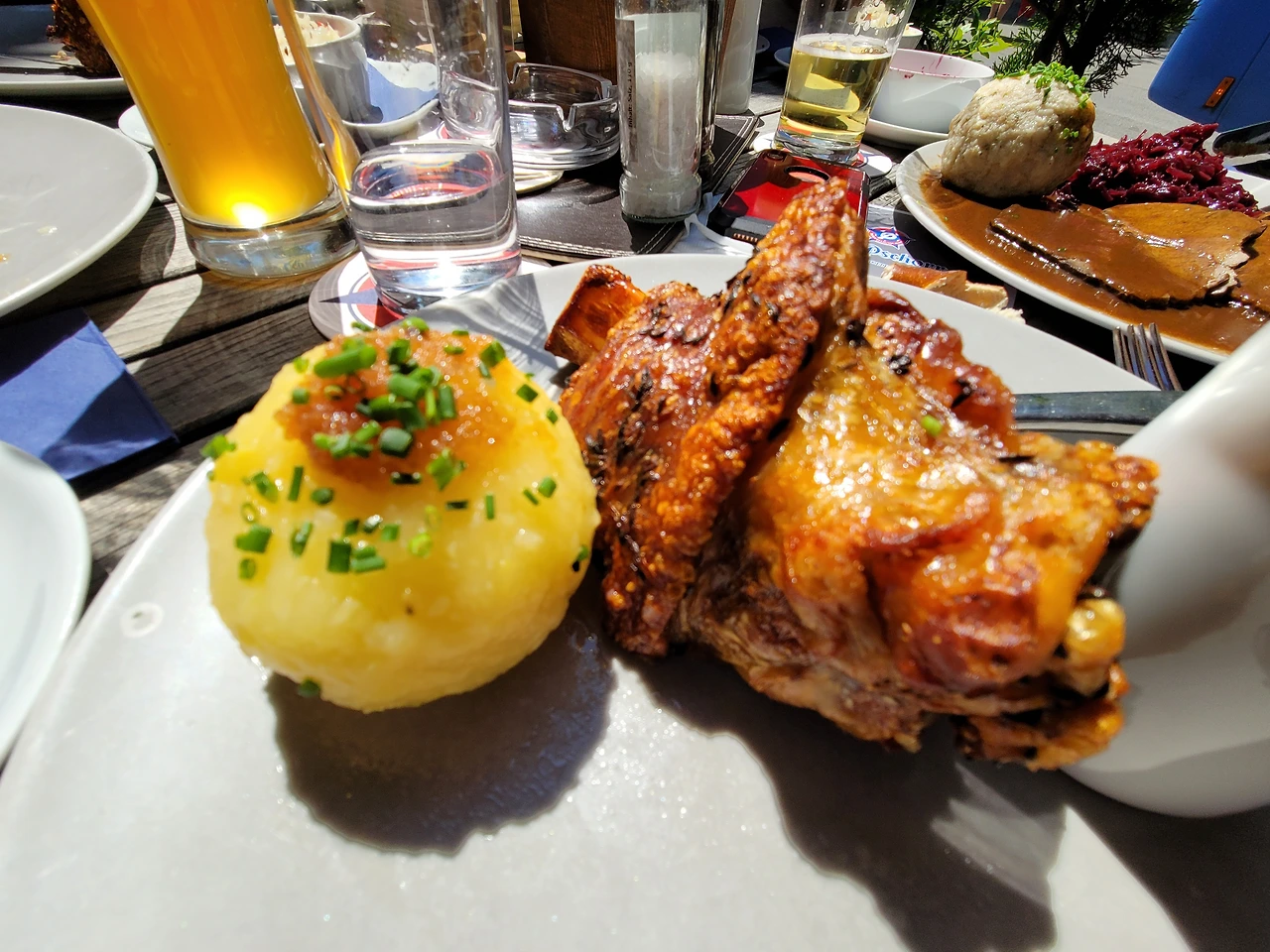 빅투알리엔 마켓 옆 비어가든 Pschorr에서 먹은 전통 음식 돼지 뒷다리 슈바인 학세와 감자 크누들(왼쪽). 오른쪽은 남편이 주문한 소고기. 곁들인 건 빵으로 만든 셈멜 크누들.