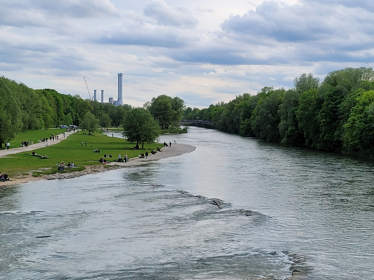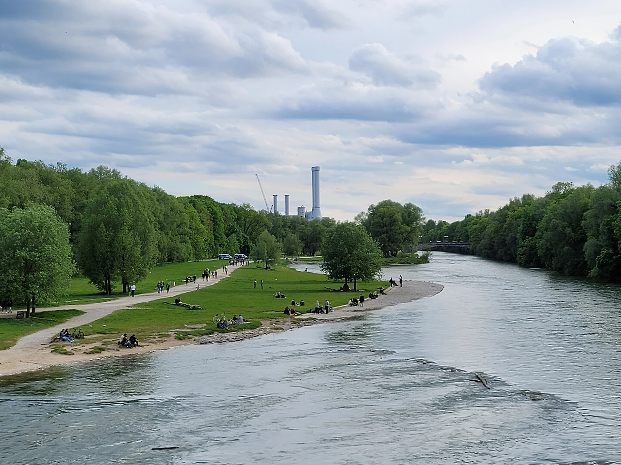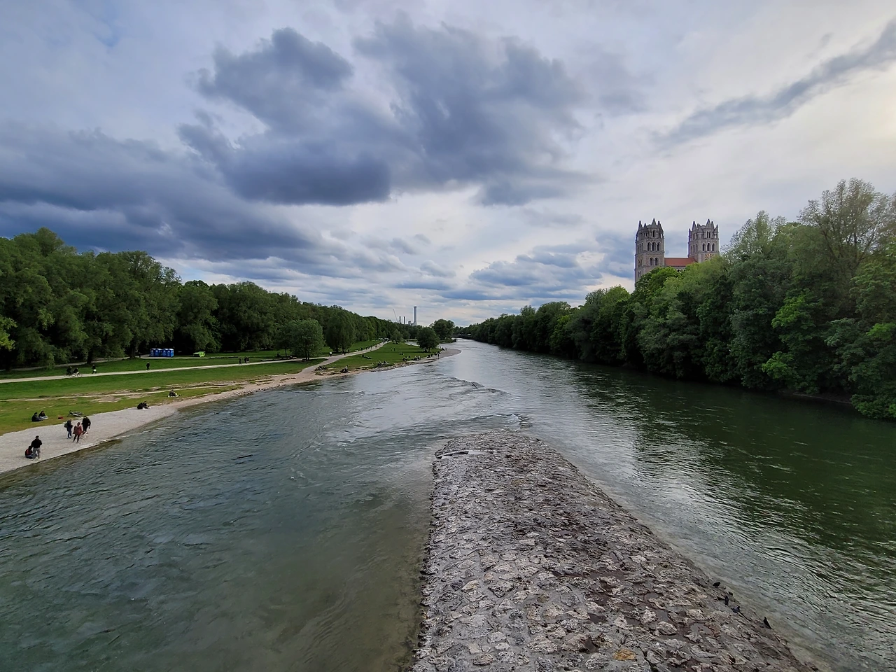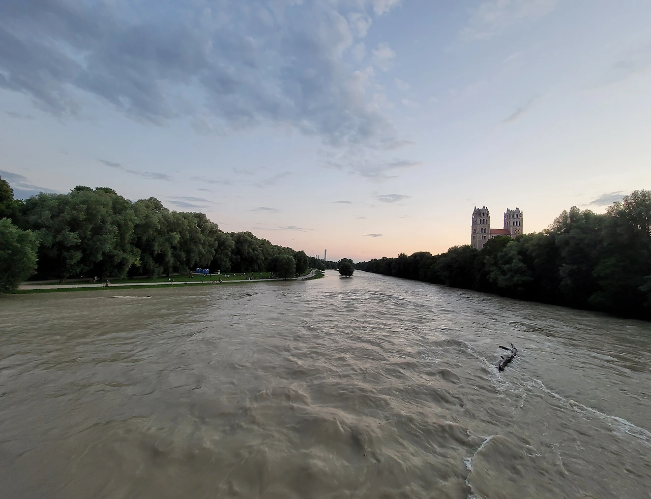 2021.5.27 저녁 7시의 이자르강. 지금은 물 속에 잠긴 가운데 산책로를 볼 수 있다.